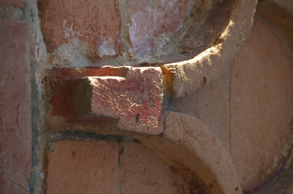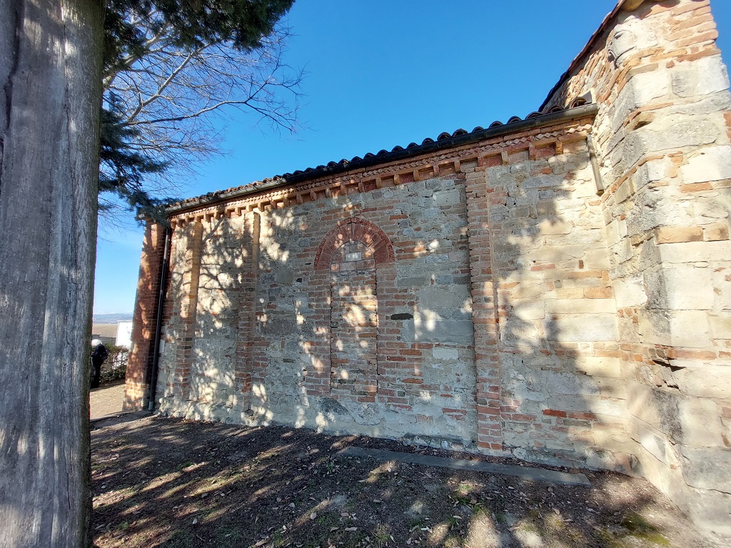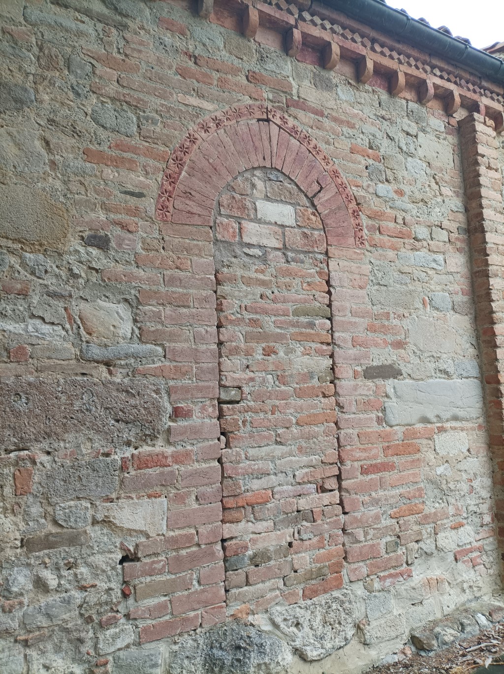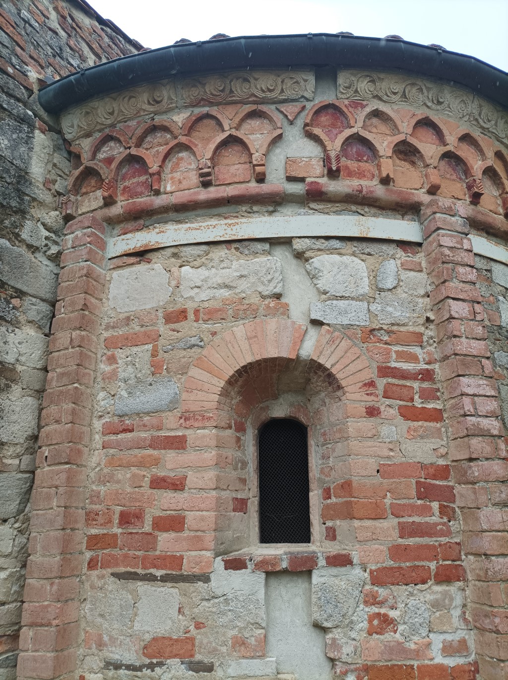 Esterno: abside costruita in mattoni e blocchi di pietra alternati con cornice a doppi archetti pensili. |