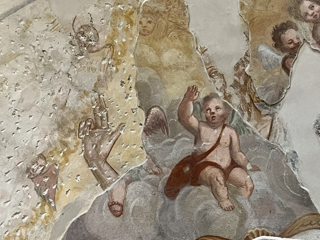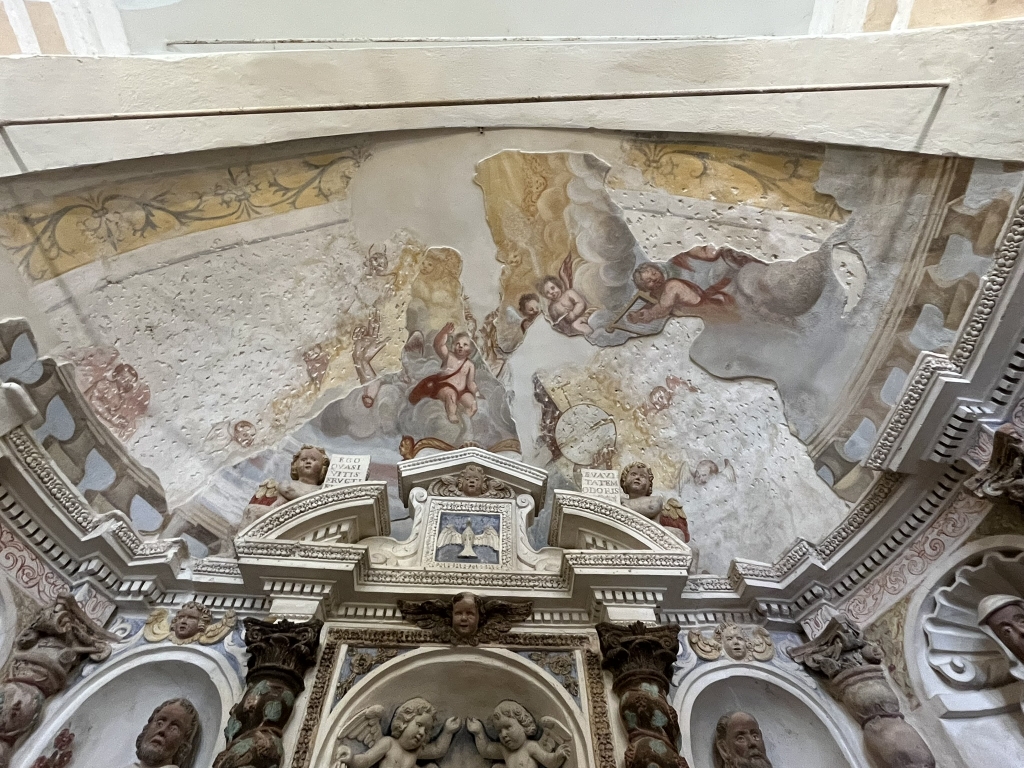 Interno: Cristo Pantocratore che sì intravede ancor oggi nella volta della cappella maggiore è testimonianza di una decorazione quattro-cinquecentesca. |