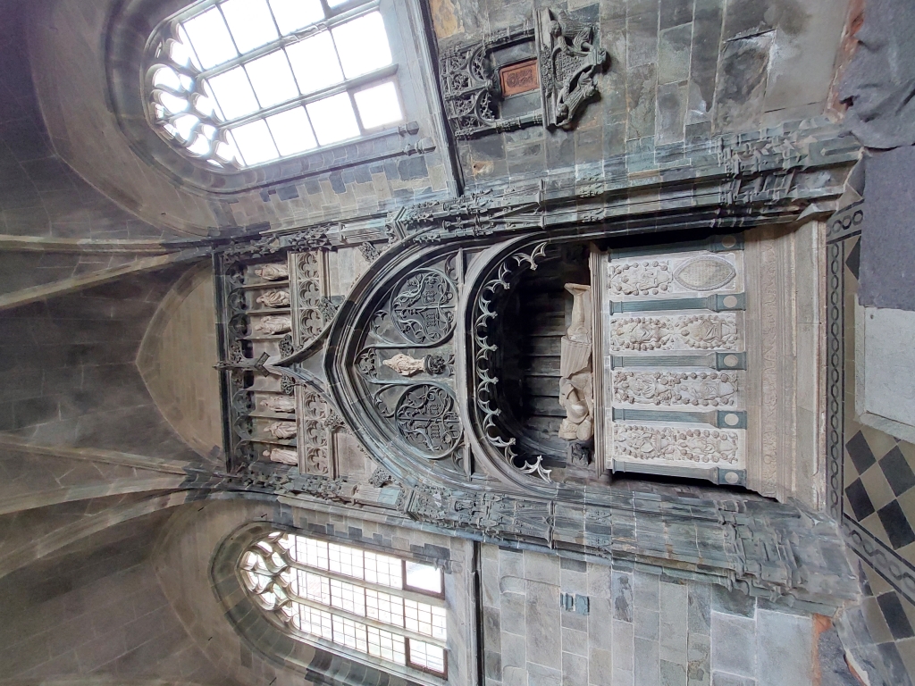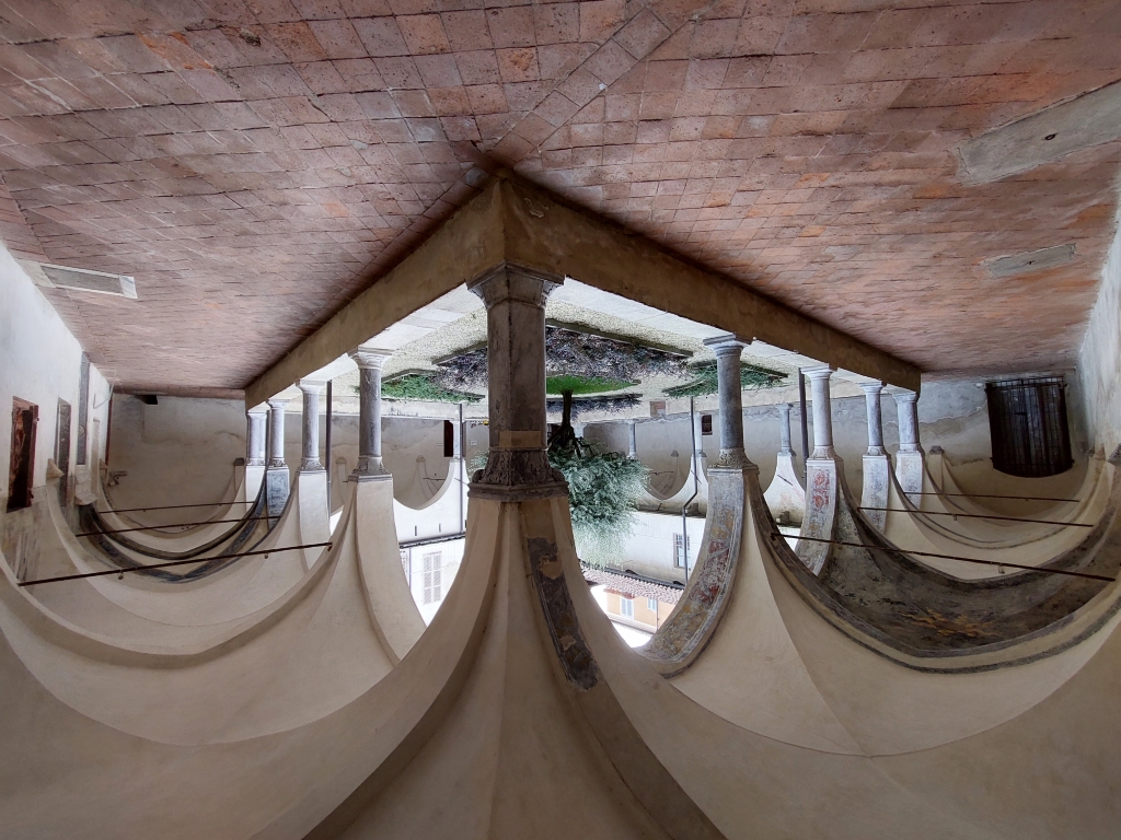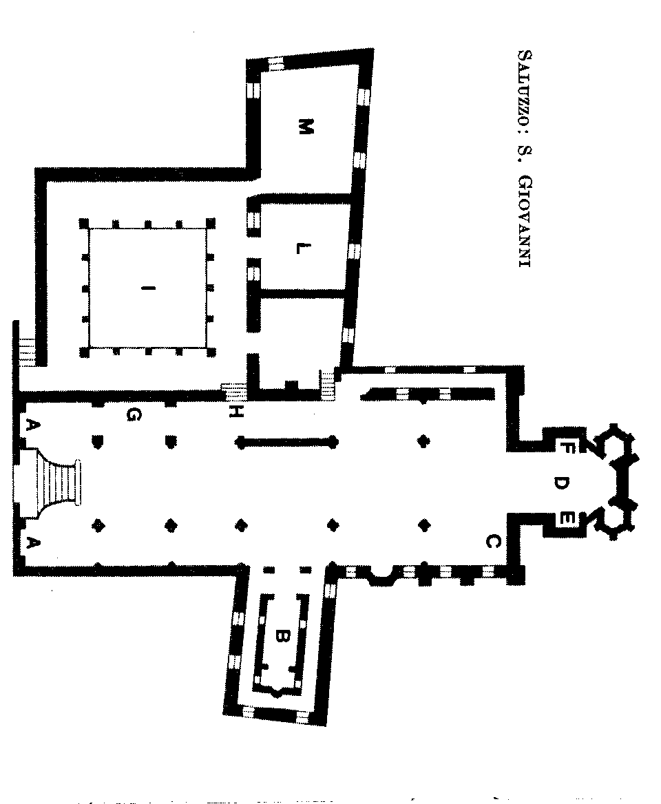 Interno: vi si accede per la scalinata inglobata nella campata aggiunta nel 1467, si presenta a pianta basilicale a tre navate divise da pilastri cruciformi che reggono volte a crociera. Sulla facciata (A) interna resti di affreschi della seconda metà del '400; in fondo alla navata destra (B) affresco del 1560 circa raffigurante il Crocifisso con San Pietro, il donatore e antenati. Dietro l'altare l'abside (C) detta cappella del Santo Sepolcro, rivestita in pietra grigio verde di Sampeyre a pianta semiottagonale con volta slanciata e esili nervature ed illuminata da quattro ampie finestre ogivali; Il coro ligneo, della fine del '400, è forse opera di monaci certosini. Sulla destra, fiancheggiato da pilastri che si perdono nelle nervature della volta, vi è un arcosolio (D) che avrebbe dovuto ospitare il monumento funebre di Margherita di Foix, sepolta invece in Spagna; si presenta con un arco depresso orlato di archetti trilobi su cui si innesta una cuspide ad arco inflesso che racchiude un timpano in cui è ripetuto il motto di Ludovico I. Segue la nicchia del lavabo con all'interno una statuetta di profeta di autore lombardo del '500 e quindi una porticina che immette in una celletta dalla chiavi di volta finemente lavorate. Al fondo dell'abside un cibori dal baldacchino finemente lavorato comunemente chiamato armadietto della spina. A sinistra (E) il sepolcro di Ludovico II in un arcosolio uguale a quello di destra; il sepolcro è opera del 1508 del lombardo Benedetto Briosco (notizie 1483-1525). Al centro dell'abside leggio gotico francese della fine del '400. Nella cappella di San Crispino ciclo di affreschi del '400 con il Padre Eterno e scene della Passione. Nella navata di sinistra alla seconda campata (H) polittico di Pascale Oddone (notizie dal 1513 - morto 1546) datato 1535 e firmato e rappresentante la Madonna col Bambino tra i Santi Giovanni battista e Domenico, il marchese Tommaso III con cortigiani e la Marchesa Margherita de Roussy con gentildonne e nella predella Saluzzo assediata nel 1487 da Carlo I di Savoia. Da una porta (F) si accede al chiostro gotico a pianta quadrata con capite.li con armi gentilizie e, sulla parete destra, Visitazione, altorilievo in cotto originariamente policromo e dal chiostro si accede al refettorio (G) che conserva sulla parete sinistra un grade affresco del Crocifisso con Santi (san Domenico, san Giovanni Battista, la Vergine, san Giovanni Evangelista, san Pietro Martire, santa Margherita) forse opera del Maestro del 1511 che ha operato nella cattedrale. Nella Cappella di SS. Pietro e Paolo Veronica con il Velo. |