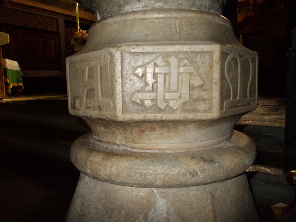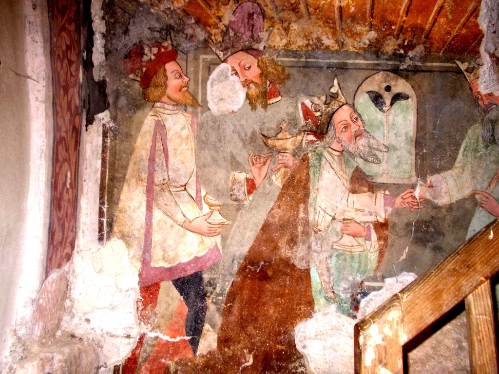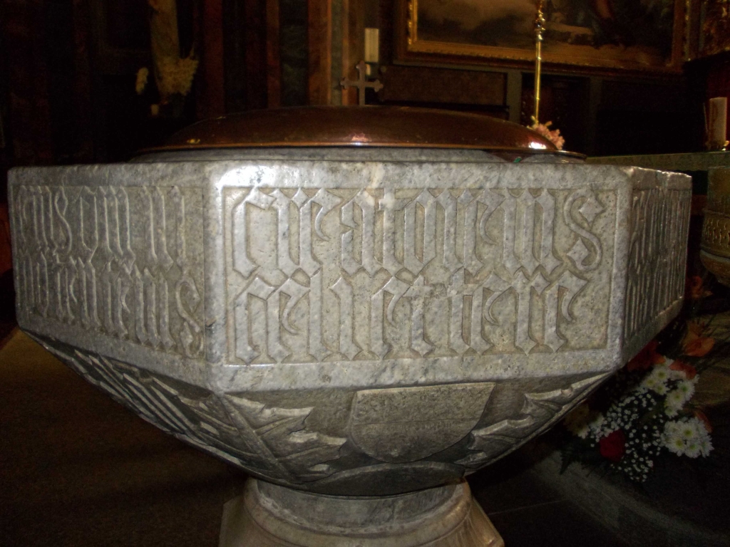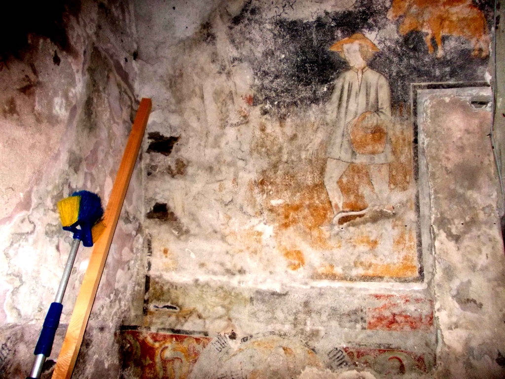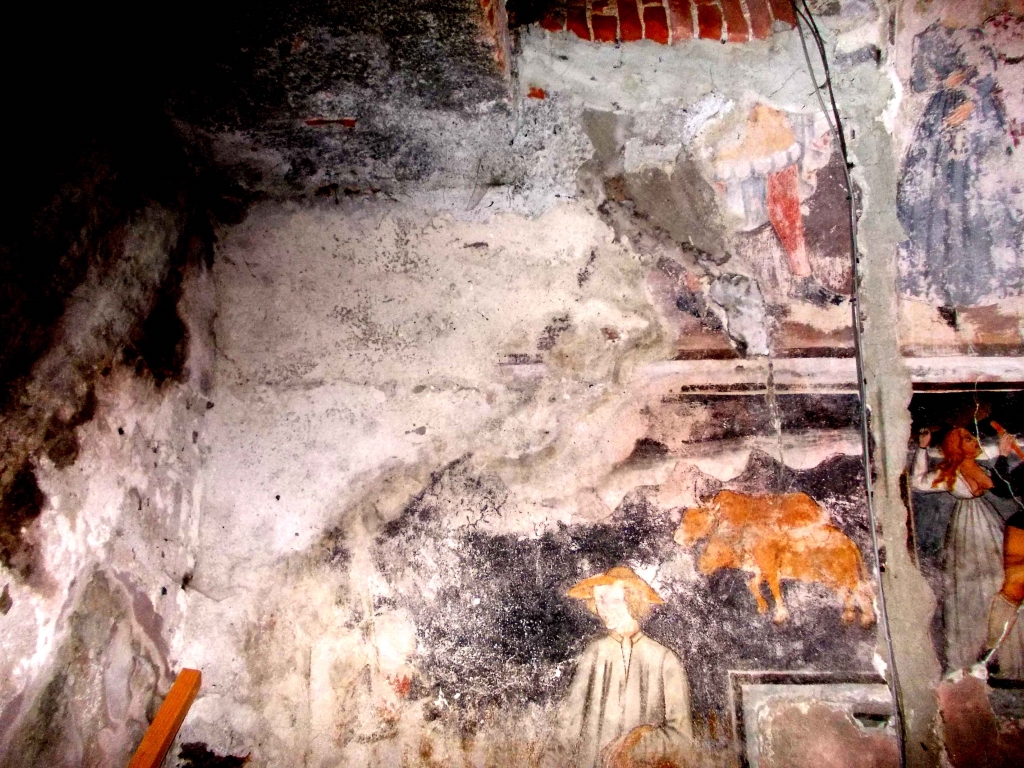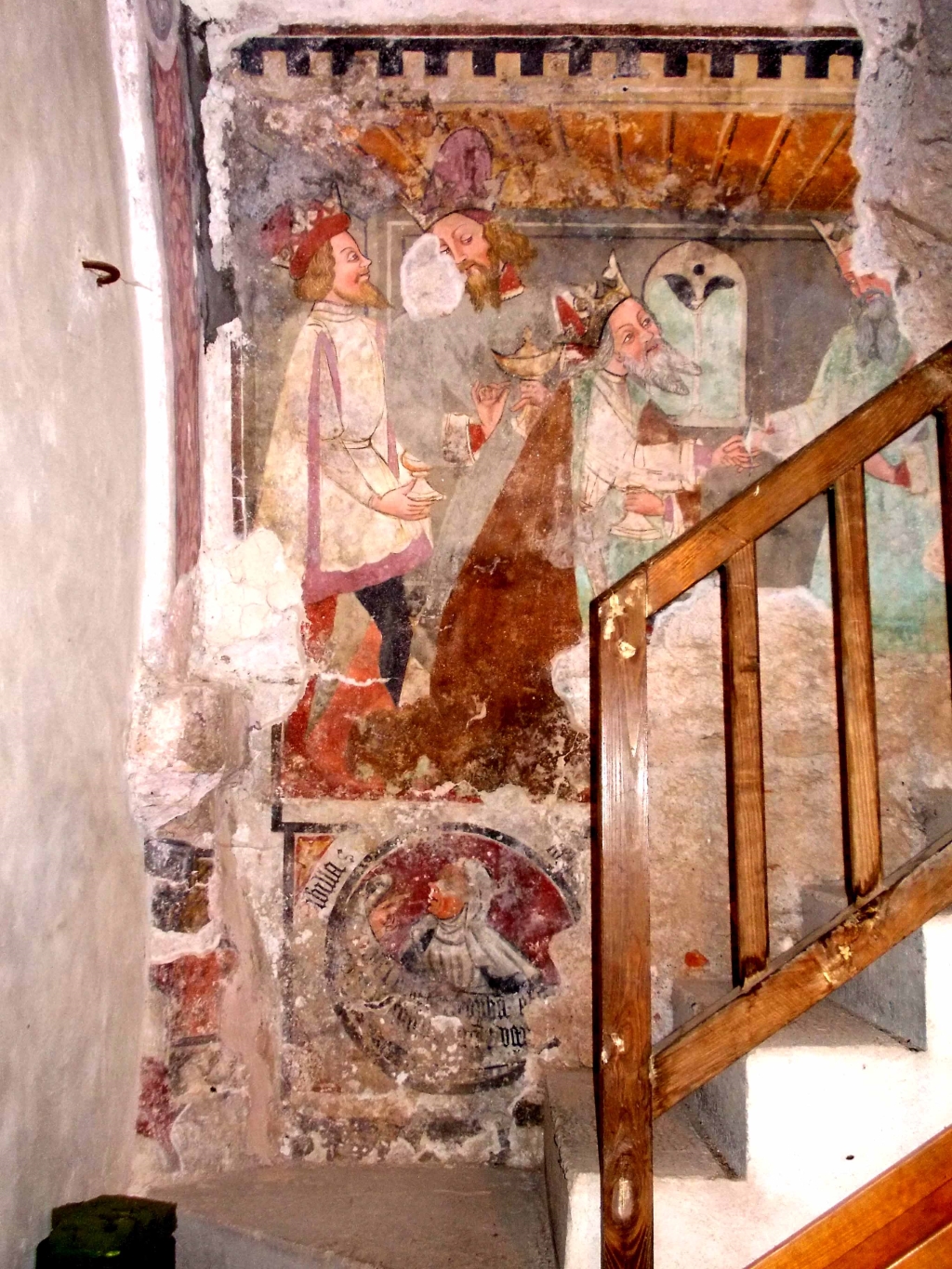fonte battesimale del 1450 e alla base del campanile ciclo di affreschi della metà del '400 raffiguranti l'Adorazione dei Magi, la strage degli innocenti, il Seminatore di Bethleem, la Presentazione di Gesù al tempio e la Visitazione e, nella porzione inferiore, entro tondi, Sibille. |