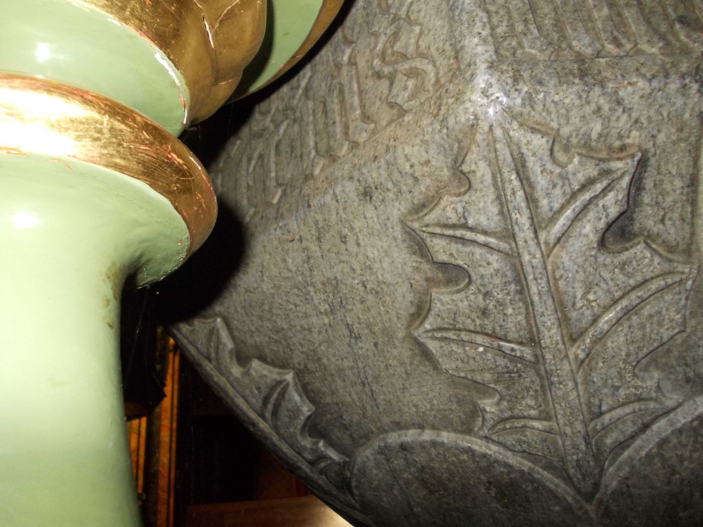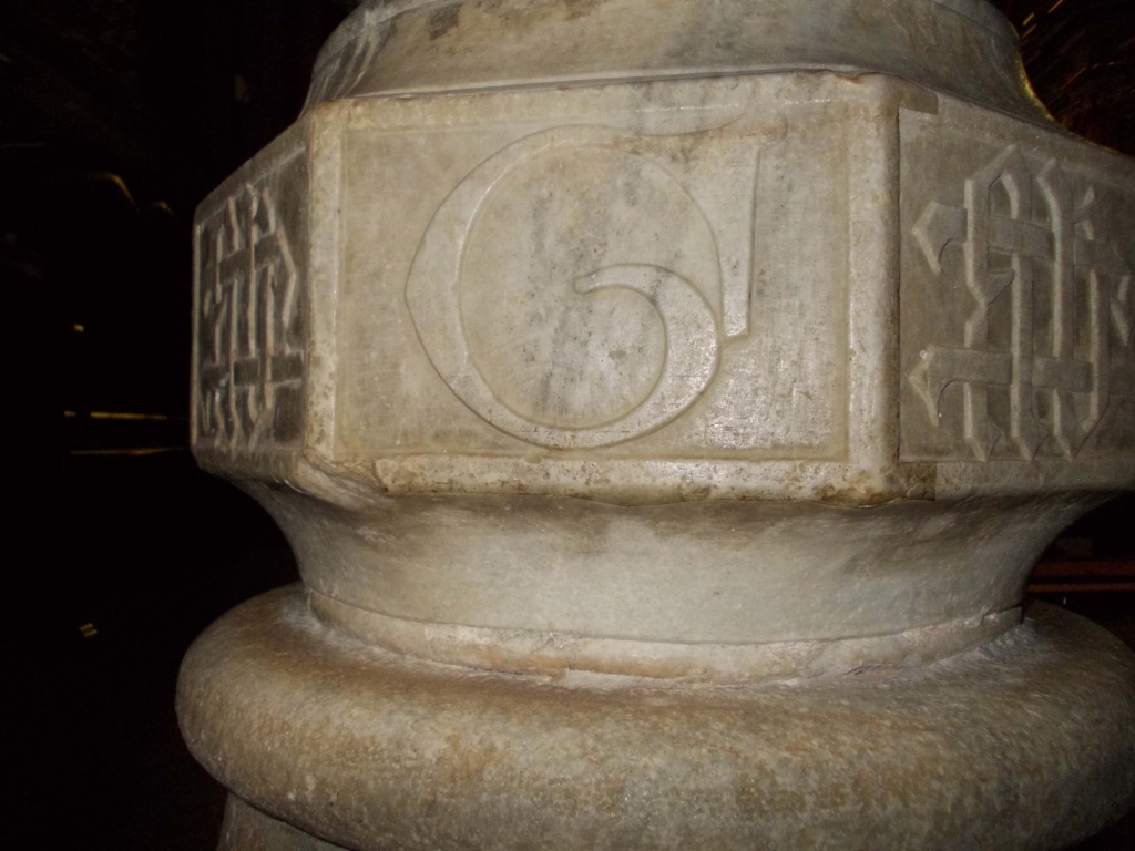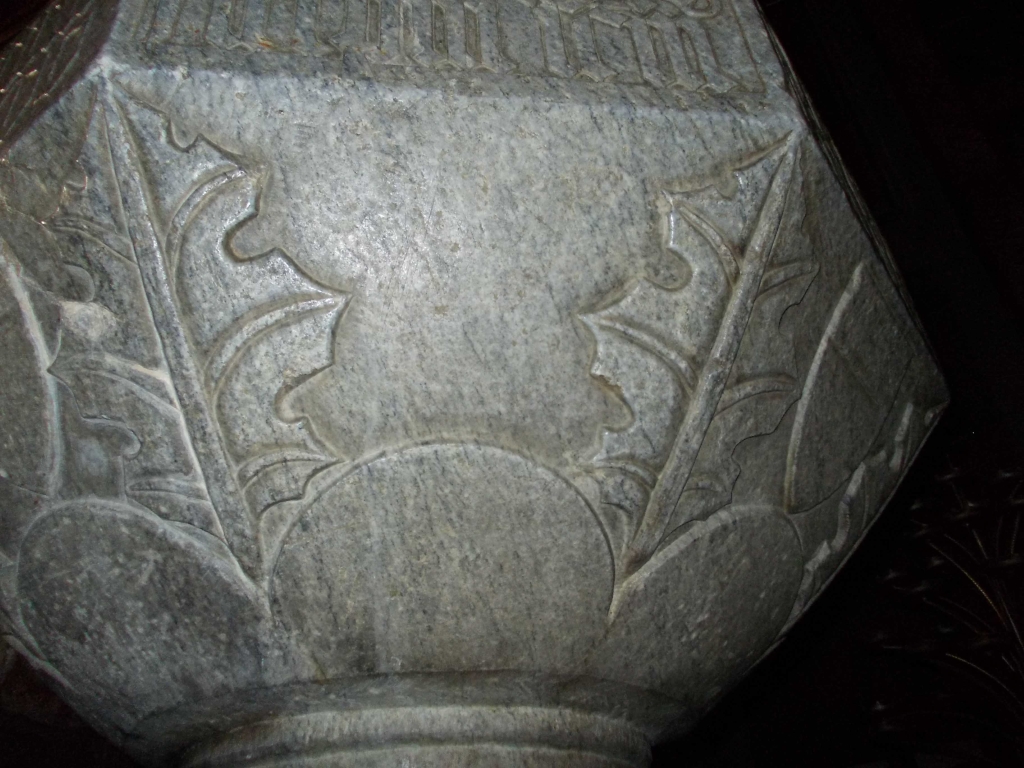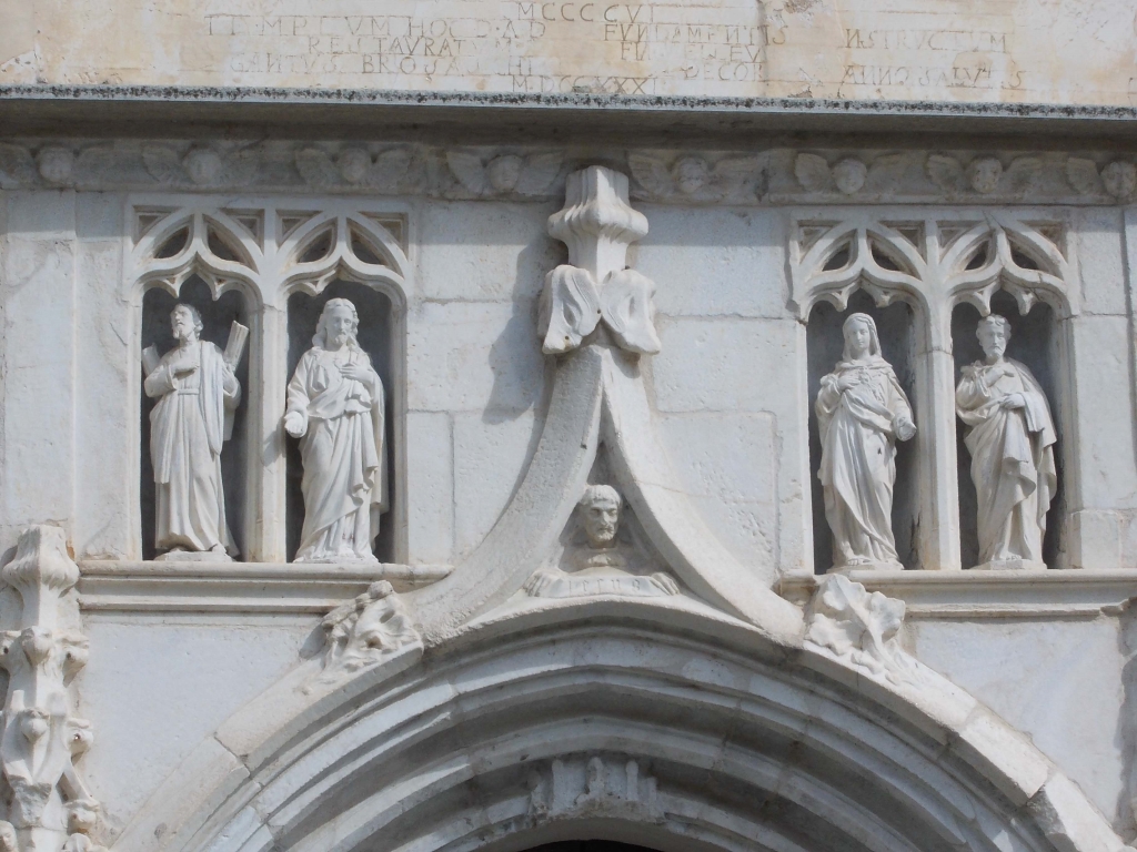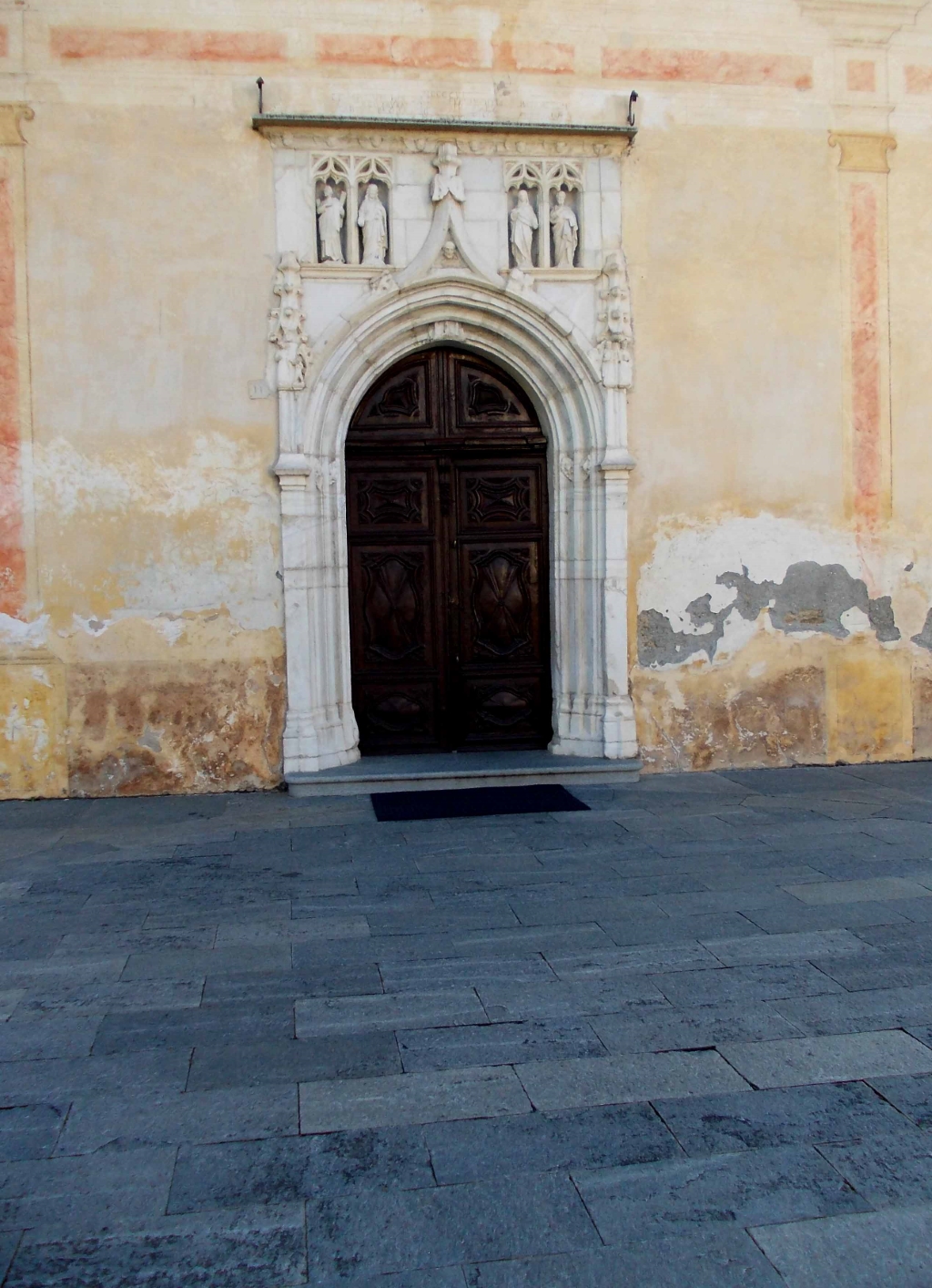 Esterno: portale gotico in marmo bianco databile tardo '400 che ricorda i modi della cappella marchionale di San Giovanni di Saluzzo, ornato superiormente di statuette entro nicchie. |