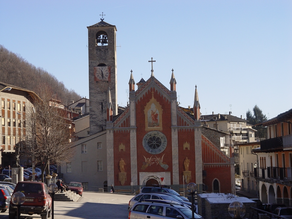 Esterno: di impianto gotico, presenta un portale principale in blocchi alternati di marmo bianco e di pietra verde locale con motivi decorativi tipici dell'area alpina. In facciata è anche presente un rosone in pietra verde. Sul lato Nord un secondo portale in marmo bianco datato 1462. |