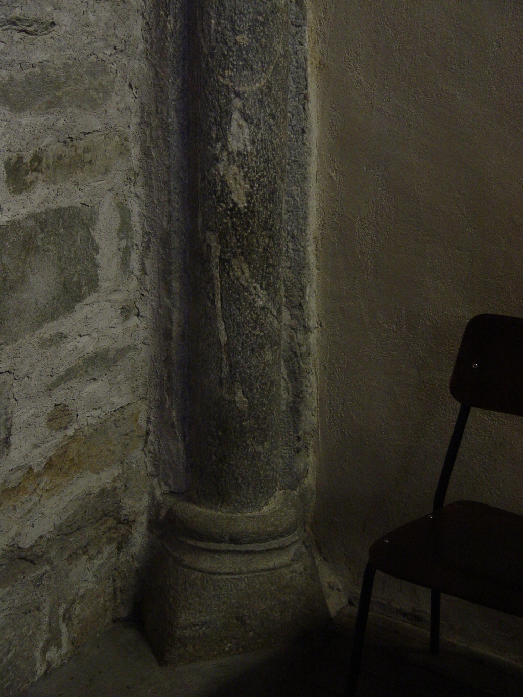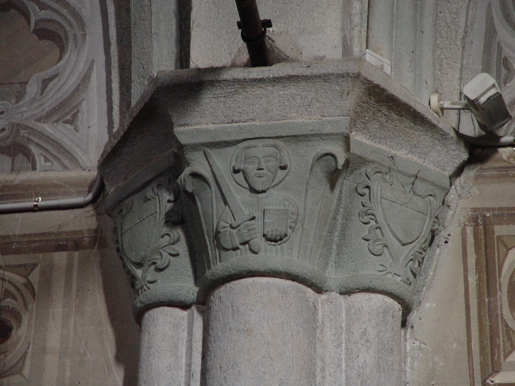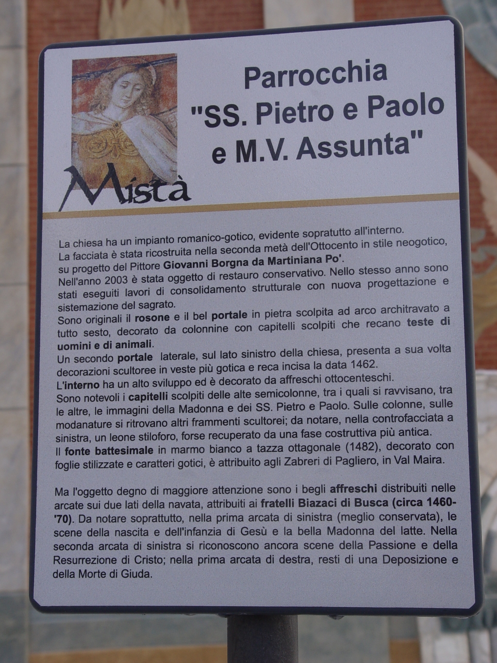 Interno: con alte colonne a fascio conserva resti di un ciclo di affreschi del '400 di cui i meglio conservati attribuiti ai Biazaci: Madonna col Bambino con ai lati la Strage degli innocenti e il Pastore di Bethleem rappresentati secondo il testo dei vangeli apocrifi; al di sopra Adorazione dei Magi; infine, frammentarie Crocifissione e Deposizione. Accanto all'altare maggiore fonte battesimale del 1482. |