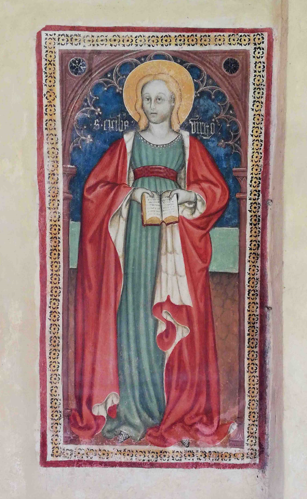 Esterno: sul fianco nord affresco di Santa Cecilia del '400 attribuito a Pietro da Saluzzo (notizie tra il 1438 e il 1480). |