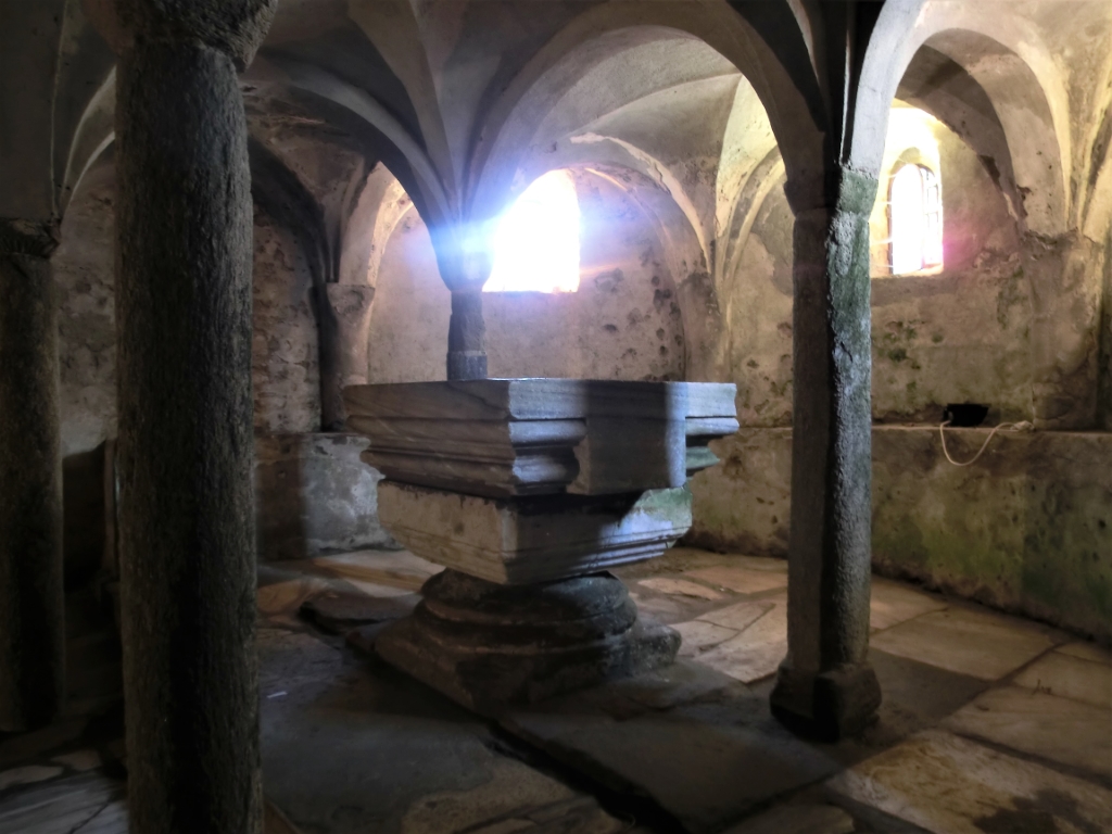 Cripta: è formata da tre locali di cui quello centrale a tre navate divisa da 12 leggere colonnine dai capitelli a motivi floreali, forse resti longobardi, e volte a vela. Biabsidata, elemento di origine medio-orientale. L'altare, resto di una colonna d'epoca augustea, fa pensare al fatto che sul luogo sorgesse un tempio romano. Ai lati due locali rettangolari, absidati, quasi due navate laterali, che comunicano con quella centrale tramite due stretti passaggi. Stilisticamente la cripta è simile a quella di Santa Maria di Testona (Moncalieri), anch'essa di origine landolfiana. |