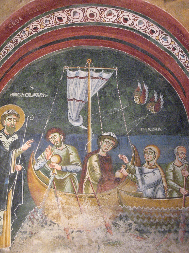 Interno: a due campate coperte la prima con volta a crociera, la seconda a botte. Vi si trovano affreschi in parte del XI-XII secolo: sulla parete interna della facciata Giudizio Universale, molto ridipinto nel 1828; sulla volta della prima campata Scene della Vita di Sant'Eldrado : abbandono della propria vita passata, raffigurata attraverso il luogo natale, il locus ambillis; l'investitura da parte di un sacerdote; l'arrivo alla Novalesa e l'abito monastico, e alle pareti Sud Miracolo e Nord Morte del Santo. La seconda campata riporta Scene della vita di San Nicola: sulle vele della volta il Santo che rifiuta il latte materno, l'aiuto prestato a una fanciulla povera; l'elezione a vescovo di Mira; la consacrazione sul seggio vescovile; sulla pareti due miracoli del Santo. Nel catino absidale Cristo Pantocrator nella mandorla tra gli Arcangeli Michele e Gabriele e in basso San Nicola e Sant'Eldrado. |