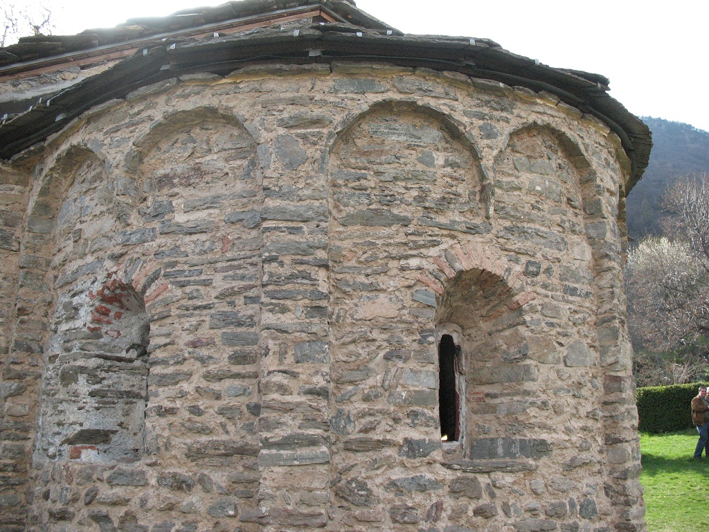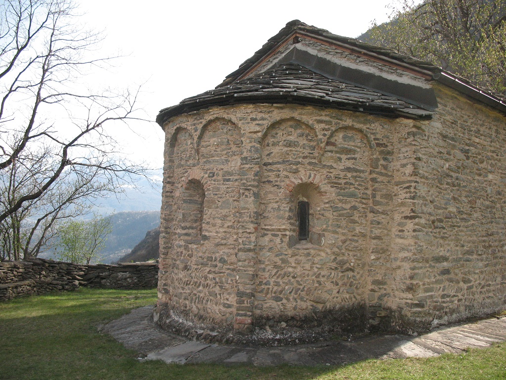 Esterno: abside curva del X secolo scandita da lesene e monofore con coronamento di grandi archi pensili. |