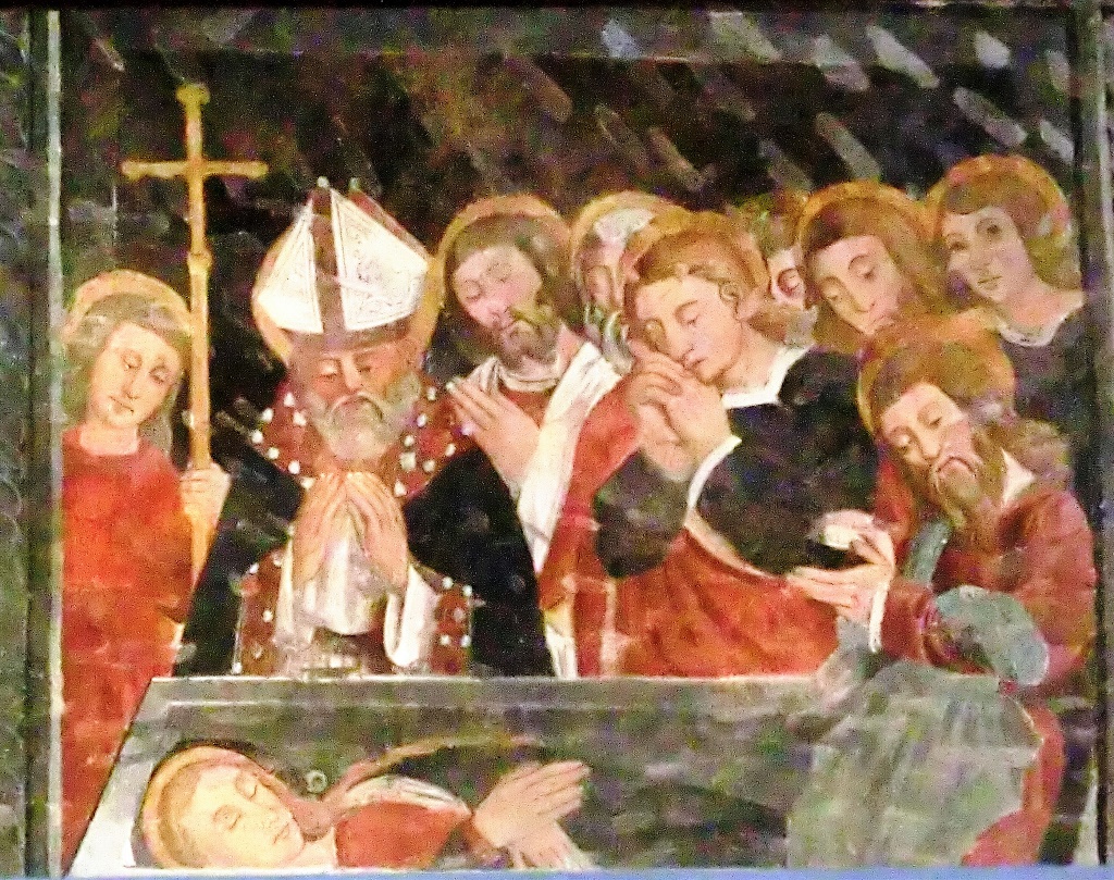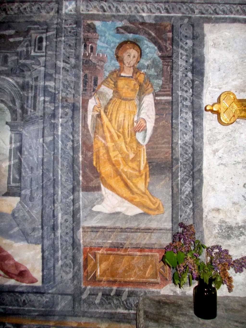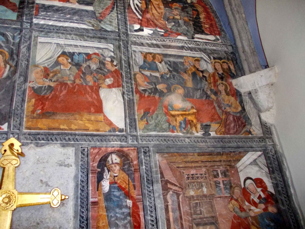 Interno: la parete di fondo è decorata con scene della vita della Vergine affiancate dalle figure di santa Barbara e di un santo vescovo. |