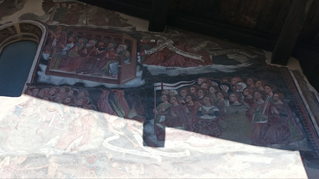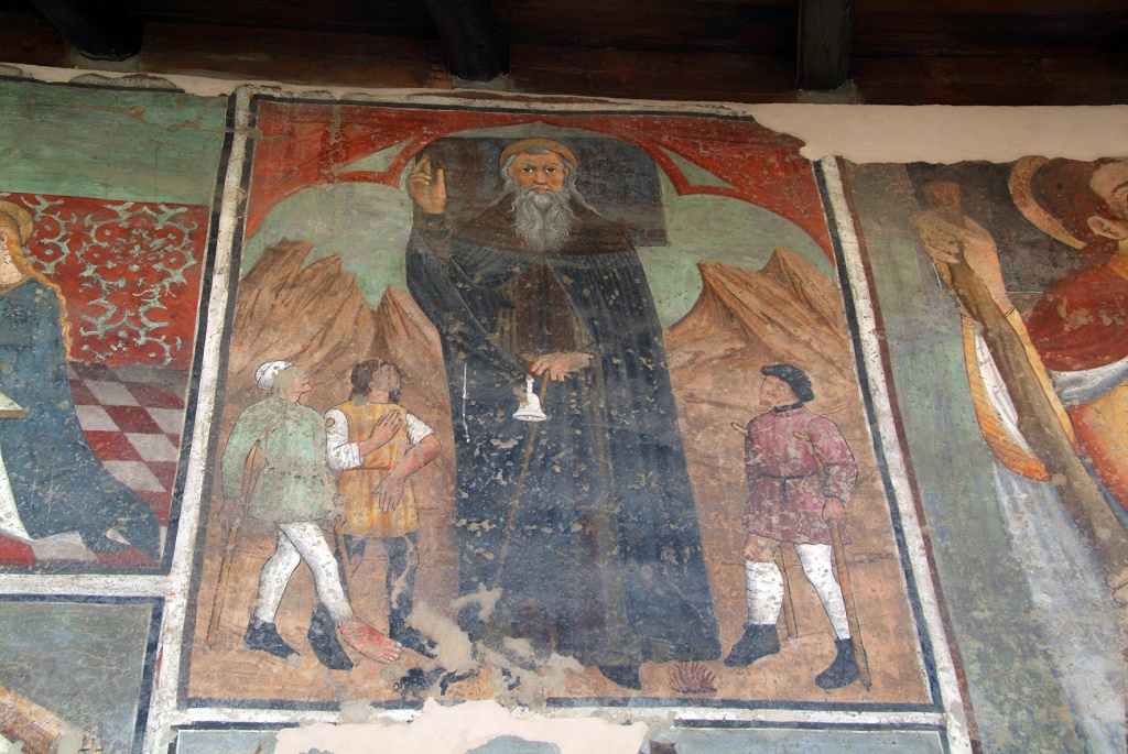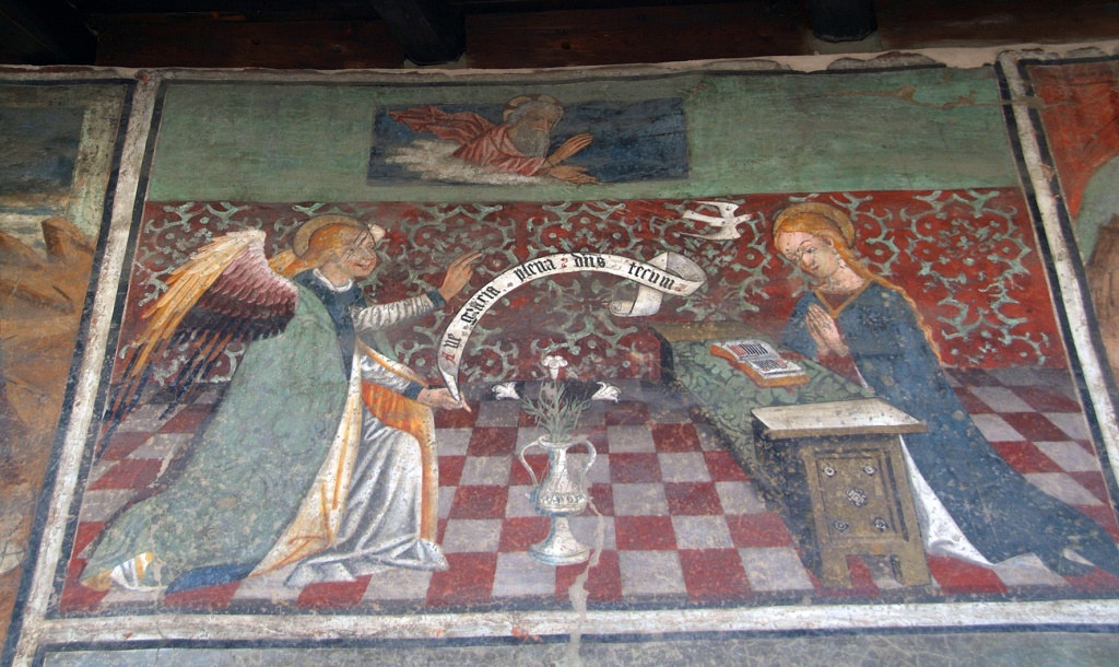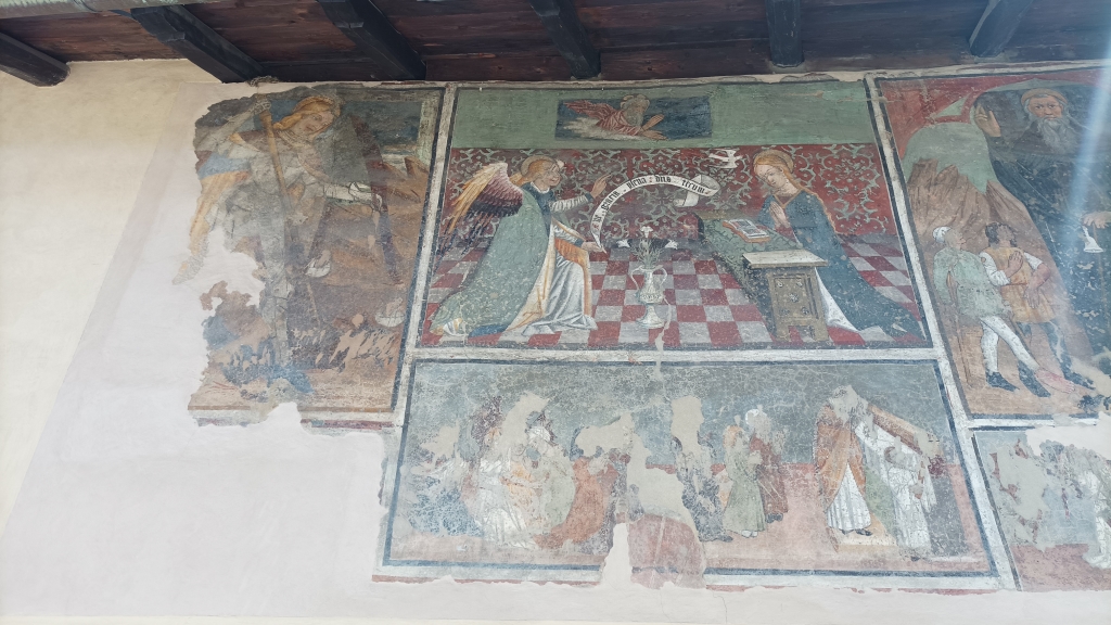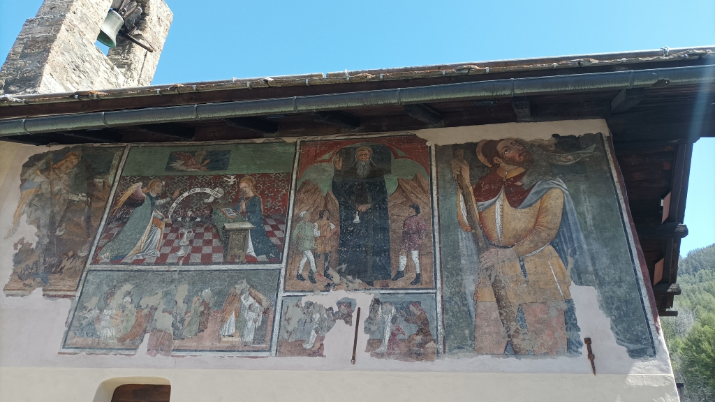 Esterno: affreschi del '500 tra cui: Giudizio Universale, San Cristoforo, Sant'Antonio, la celebrazione della messa, Annunciazione, San Michele. |