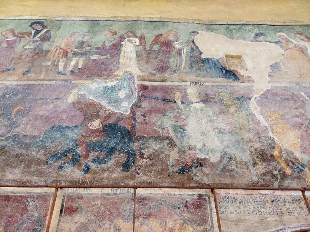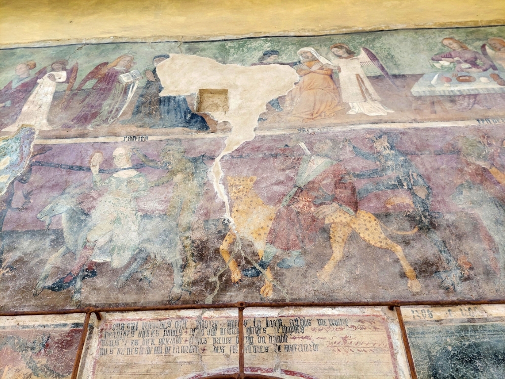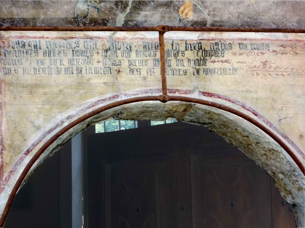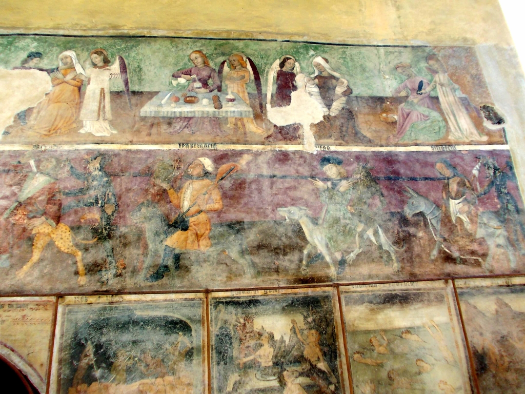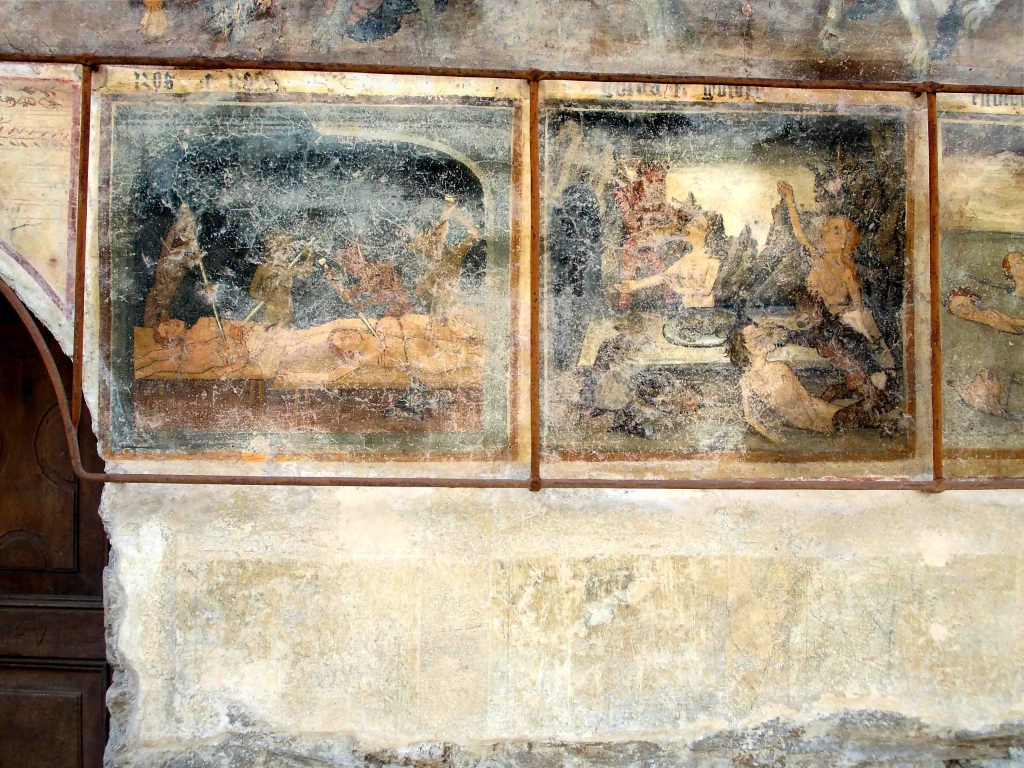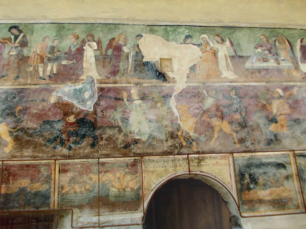 Esterno: sulla parete esterna, prospiciente la strada, affresco tardogotico (XV secolo) rappresentante il tema "I vizi, le virtù e le pene dell'inferno". L'opera si svolge su tre registri: il superiore è dedicato alle virtù, rappresentate da figure femminili ognuna assistita dall'angelo custode, che si presentano a San Pietro (da sinistra: Umiltà, Generosità, Castità, Pazienza, Temperanza, Carità e Diligenza). Nel registro mediano, sotto ogni virtù, è rappresentato il vizio contrario mediante uomini e donne cavalcanti animali e pungolati da diavoli che avanzano verso l'inferno rappresentato dalle fauci di un mostro (da sinistra: Orgoglio, Avarizia, Lussuria, Collera, Gola, Invidia e Accidia). Il registro inferiore descrive le pene dell'inferno a cui verranno condannati i peccatori. |