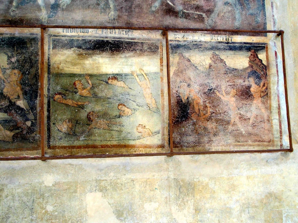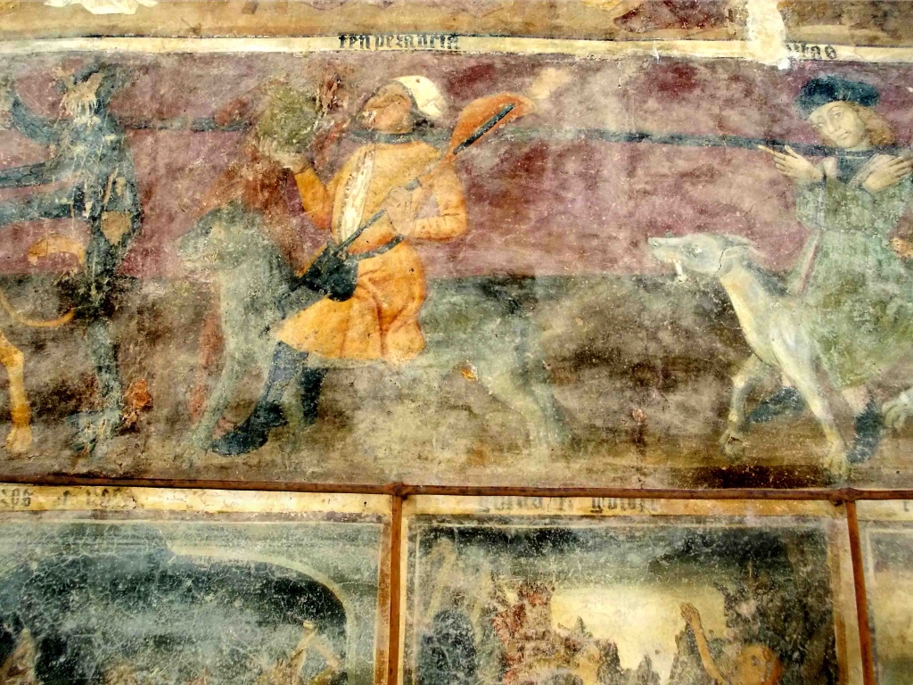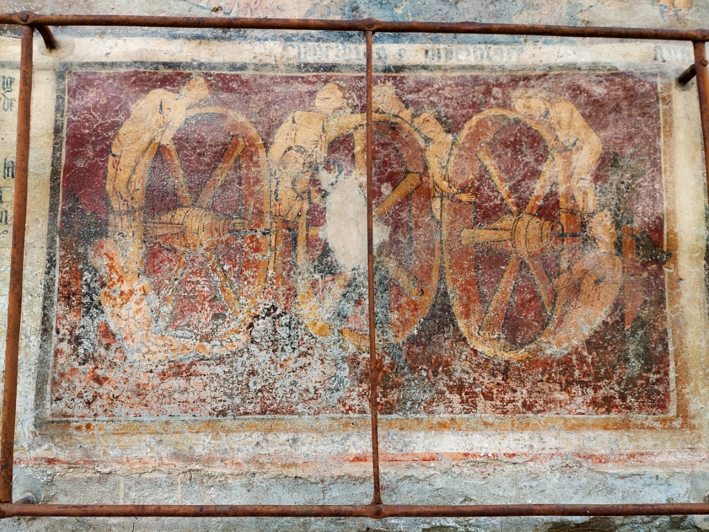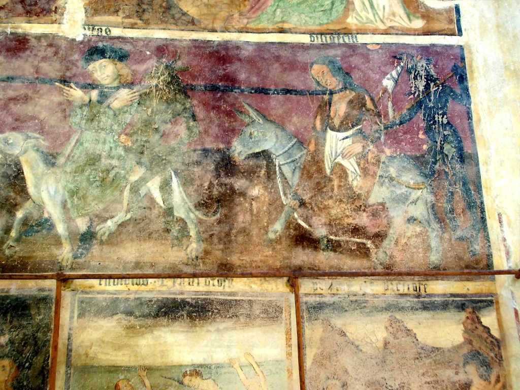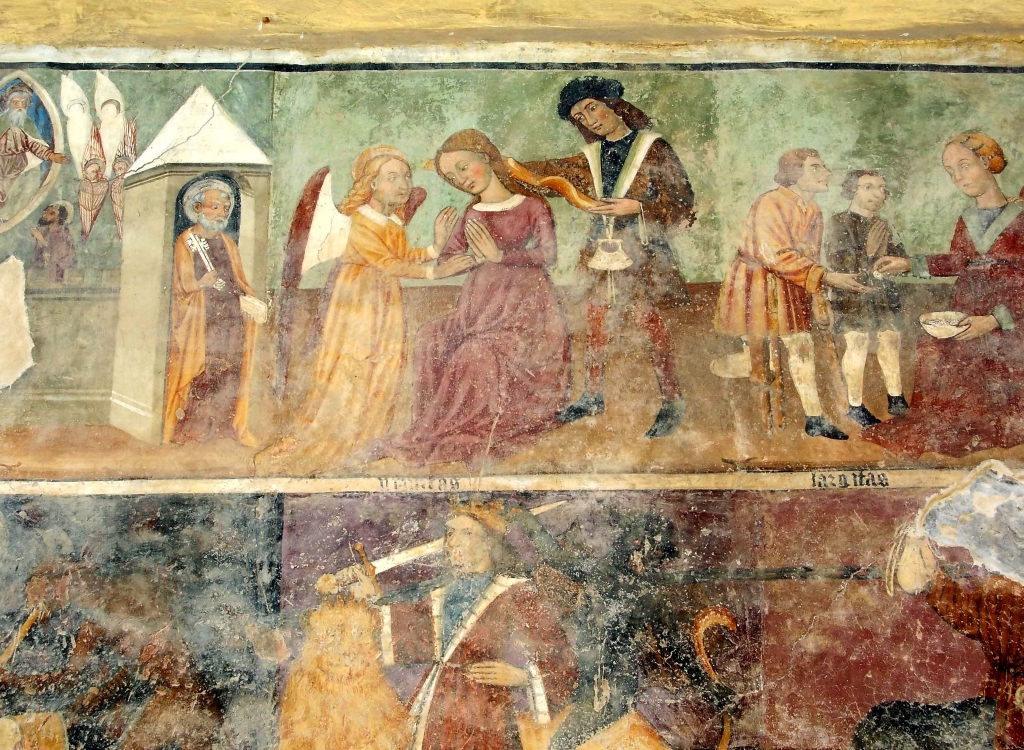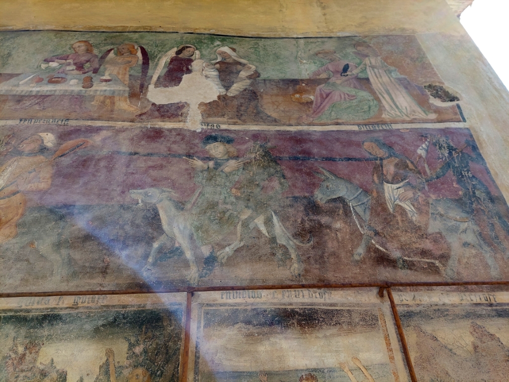 Esterno: sulla parete esterna, prospiciente la strada, affresco tardogotico (XV secolo) rappresentante il tema "I vizi, le virtù e le pene dell'inferno". L'opera si svolge su tre registri: il superiore è dedicato alle virtù, rappresentate da figure femminili ognuna assistita dall'angelo custode, che si presentano a San Pietro (da sinistra: Umiltà, Generosità, Castità, Pazienza, Temperanza, Carità e Diligenza). Nel registro mediano, sotto ogni virtù, è rappresentato il vizio contrario mediante uomini e donne cavalcanti animali e pungolati da diavoli che avanzano verso l'inferno rappresentato dalle fauci di un mostro (da sinistra: Orgoglio, Avarizia, Lussuria, Collera, Gola, Invidia e Accidia). Il registro inferiore descrive le pene dell'inferno a cui verranno condannati i peccatori. |