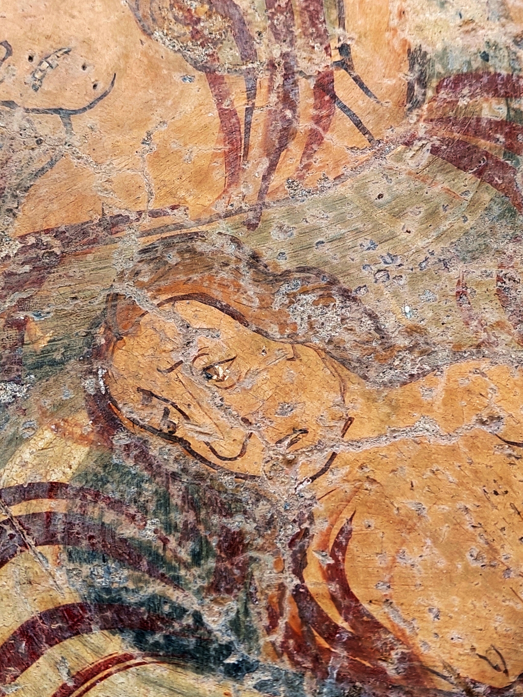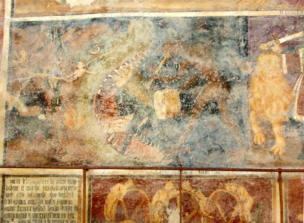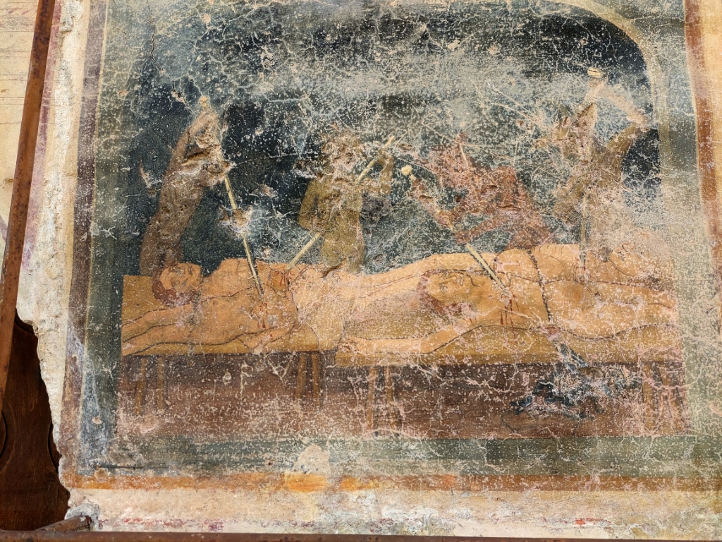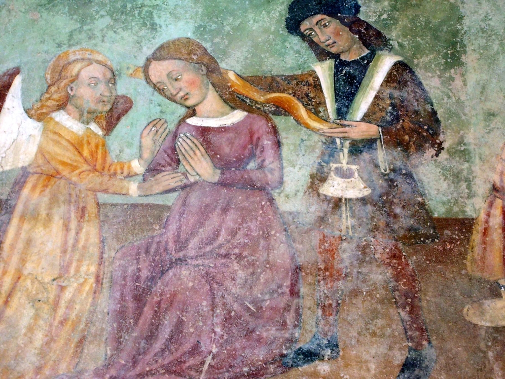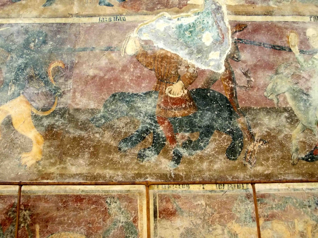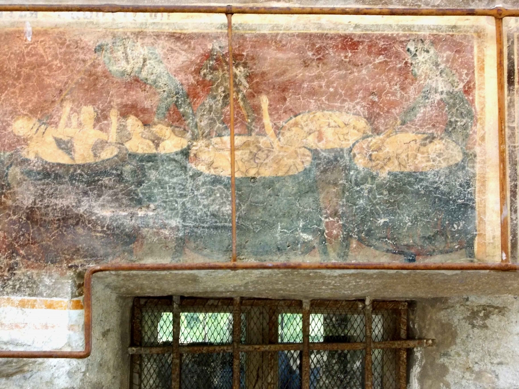 Esterno: sulla parete esterna, prospiciente la strada, affresco tardogotico (XV secolo) rappresentante il tema "I vizi, le virtù e le pene dell'inferno". L'opera si svolge su tre registri: il superiore è dedicato alle virtù, rappresentate da figure femminili ognuna assistita dall'angelo custode, che si presentano a San Pietro (da sinistra: Umiltà, Generosità, Castità, Pazienza, Temperanza, Carità e Diligenza). Nel registro mediano, sotto ogni virtù, è rappresentato il vizio contrario mediante uomini e donne cavalcanti animali e pungolati da diavoli che avanzano verso l'inferno rappresentato dalle fauci di un mostro (da sinistra: Orgoglio, Avarizia, Lussuria, Collera, Gola, Invidia e Accidia). Il registro inferiore descrive le pene dell'inferno a cui verranno condannati i peccatori. |