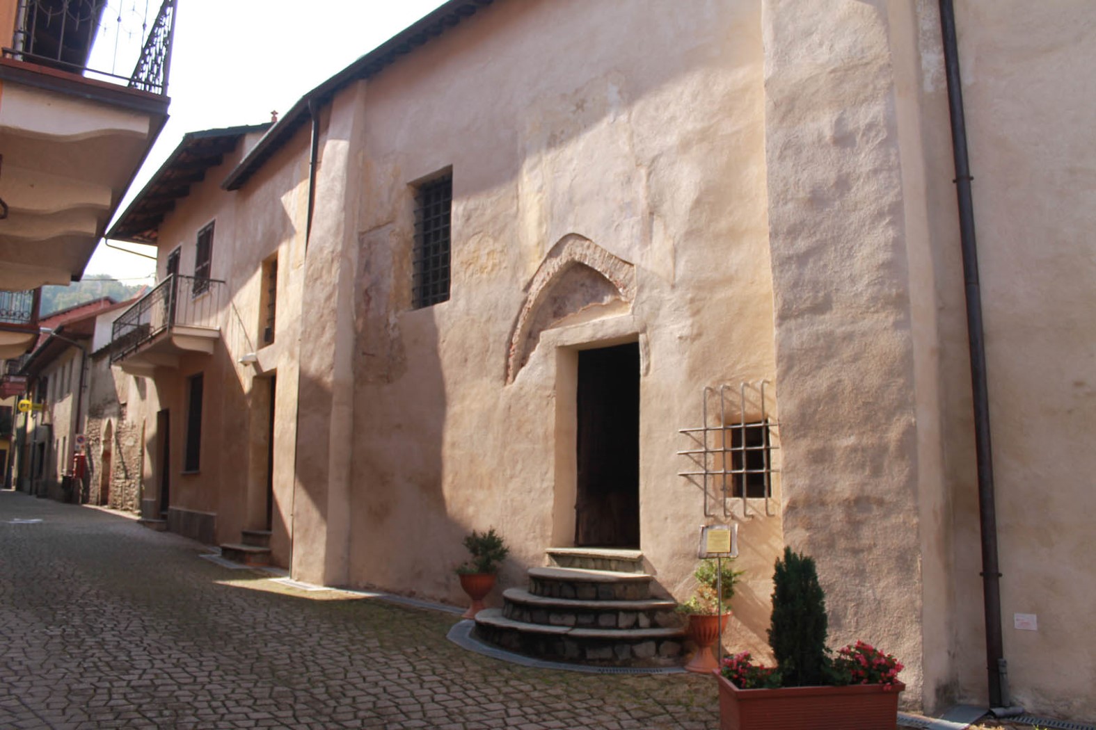 Interno: pareti e volta a croce sono coperte di affreschi del '400 di artista probabilmente lombardo della prima metà del '400 e rappresentano il Padre Eterno, la Pietà, gli Evangelisti, i Dottori della Chiesa e Santi: Santa Apollonia con la palma del martirio, San Bernardina da Siena con ai piedi le tre mitre vescovili rifiutate; una Madonna del latte di schema bizantino con angeli musicanti. |