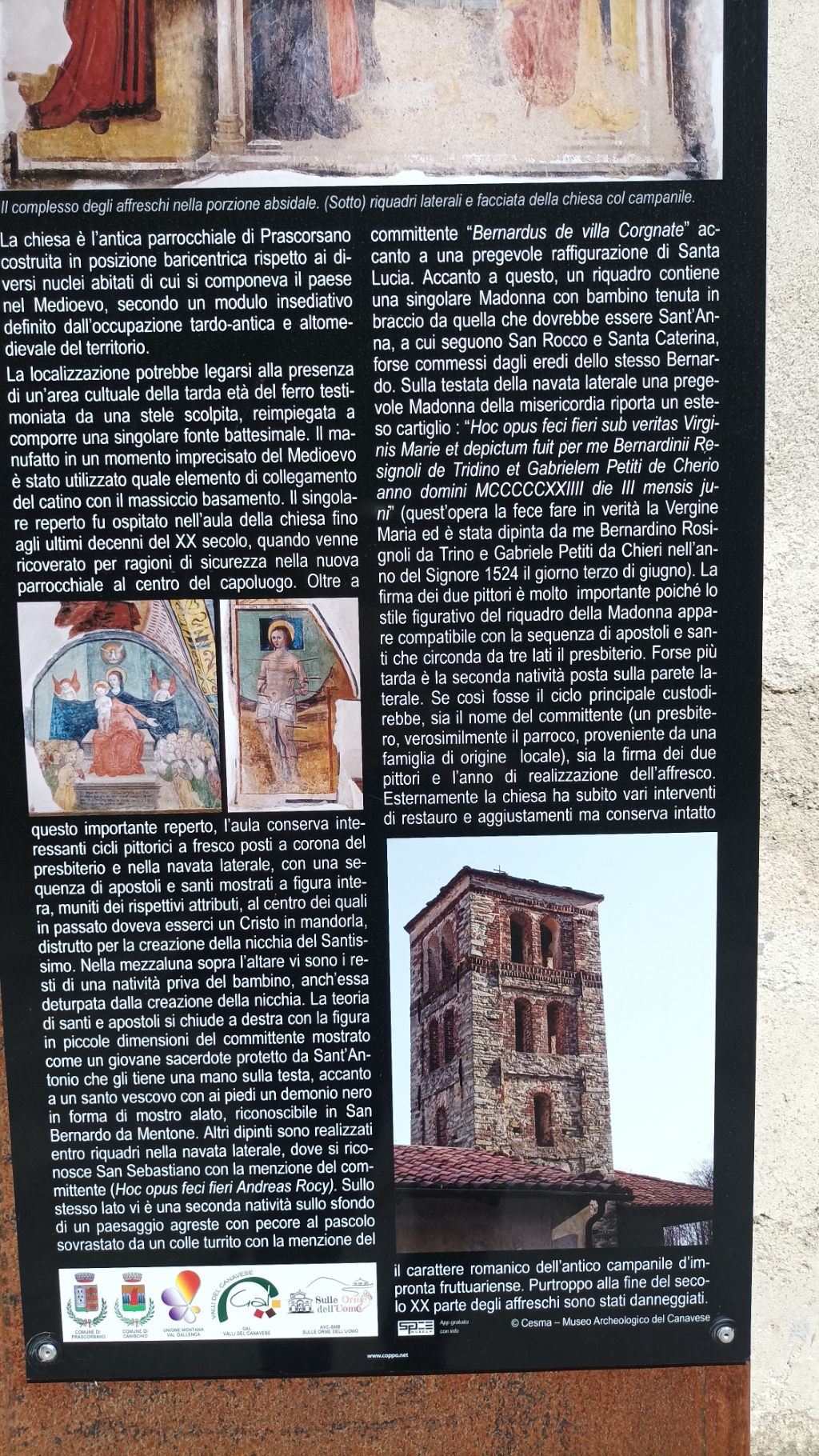Interno: capitelli romanici e pitture del '400 e '500, tra cui, in cattivo stato, Presepio di Jacopino Longo (notizie dal 1508 - morto dopo il 1546) del 1522, Santi, madonna della Misericordia firmata da Bernardino Rossignolo di Trino, datata 1524. |