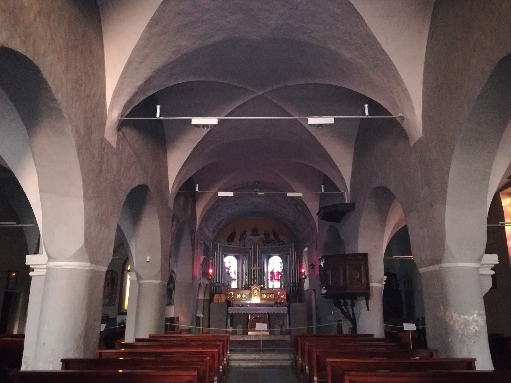 Interno: affreschi probabilmente del 1503 raffiguranti la Vergine in Trono con San Sebastiano sono nella navata destra all'altare dei Santi Fabiano e Sebastiano. Nell'ultima lunetta a sinistra della navata centrale Presentazione al Tempio di Giosuè Oldoni (circa 1463-dopo 1522). Ai lati dell'altare della Madonna nella navata sinistra San Lorenzo e San Domenico di pittore della scuola vercellese. A fianco vetrata del '500 istoriata raffigurante un Re che adora e porge doni a Gesù e in basso lo stemma della famiglia Vialardi. |