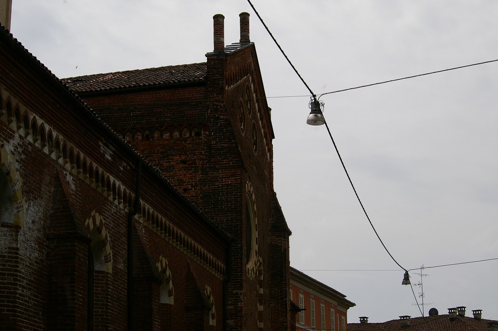 Interno: a tre navate divise da colonne e pilastri alternati che reggono archi e volte ogivali. Nella sesta cappella della navata sinistra Madonna Col Bambino, Santi e un devoto di scuola laniniana e un Sant'Ambrogio di Girolamo Giovenone (1490-1555) del 1535. |