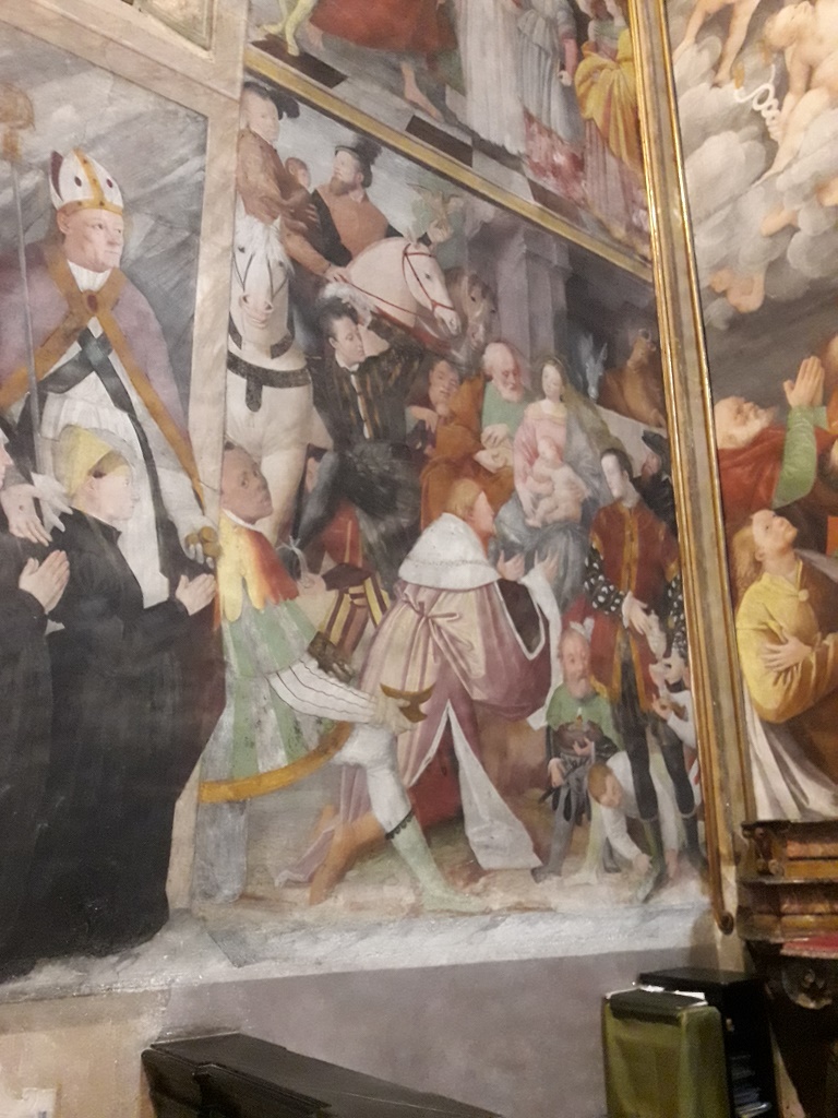 Interno: ciclo di affreschi rinascimentali, opera di Gaudenzio Ferrari (1477-1546) che li dipinse tra il 1529 e il 1534. Nella cappella della Maddalena, a destra del presbiterio, sopra l'altare, Crocifissione e alla parete laterale episodi della leggenda di Maria Maddalena, di cui alcuni riquadri sono stati danneggiati dalle cannonate spagnole nell'assedio del 1638 (Gesù predicante, Noli me tangere, Assunzione della Santa), restano ben conservati Maria Maddalena ai piedi di Gesù, Marta e Maria Maddalena al sepolcro, Maria Maddalena Marta e Lazzaro che accolgono i principi di Marsiglia di ritorno dalla Palestina, Morte della Santa benedetta dal Vescovo Massimino, un angelo con una lunga iscrizione che illustra la leggenda e il committente, Giovanni Angelo Corradi di Lignana, ritratto in preghiera in basso nella crocefissione. Nella cappella dell'Assunta, a sinistra del presbiterio, su commessa di Andrea Corradi di Lignana, affreschi del 1533-34 con storie della vita di Maria: sopra l'altare Assunzione, alle pareti laterali Santa Caterina da Siena, e San Niccolò con due devote, l'Annuncio ad Anna e Gioacchino, la Presentazione al Tempio, la Visitazione, la nascita e matrimonio di Maria, l'adorazione di Gesù e l'arrivo dei Re Magi. In fondo all'abside tavola del 1529 raffigurante la Madonna degli Aranci fra i Santi Cristoforo, Giovanni battista, Giuseppe, Nicola da Bari, un beato e il fondatore della chiesa Nicolino Corradi. |