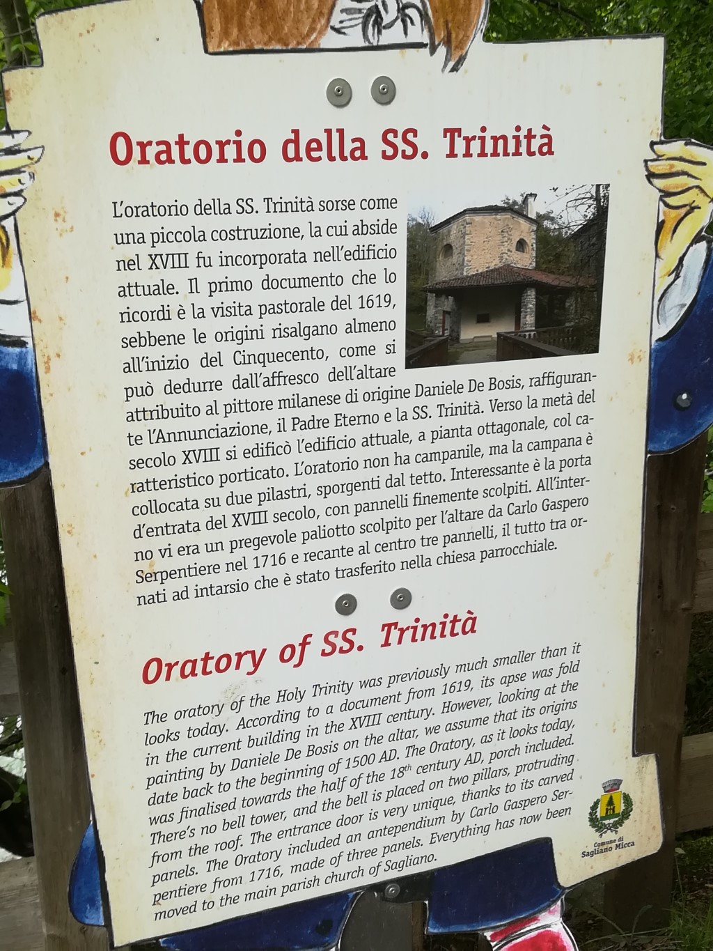 L'Oratorio si trova a Sagliano Micca (BI), noto come Trinità. Periodo prevalente: XIV secolo. Livello di interesse: 1 (Interessante). Elementi presenti: architettura, pittura. Da vedere: esterno, interno.