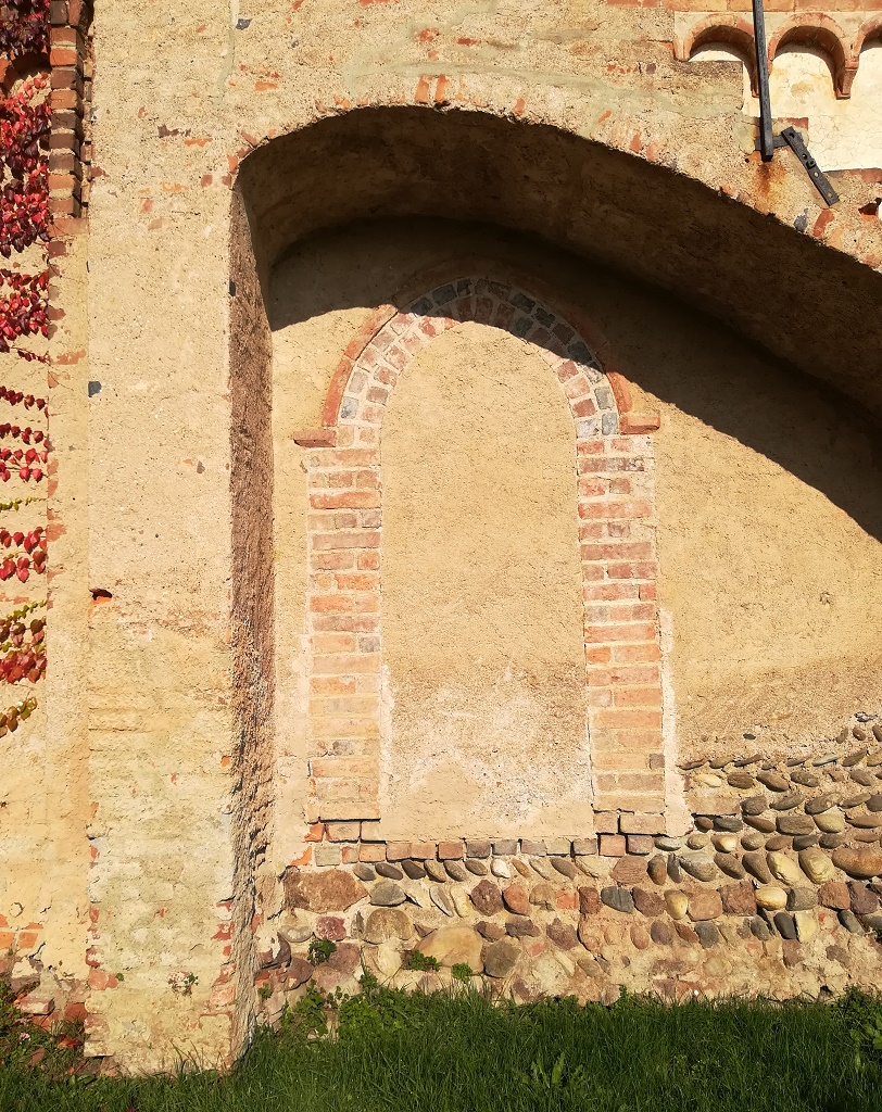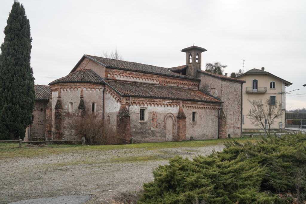 Esterno: abside contraffortata con fregio ad archetti, sotto al quale si trova incisa la data 4 ottobre 1488 e il nome dell'architetto Petro de Betulio (Pietro da Bioglio). Fianchi con coronamento ad archetti pensili e fregio a dente di sega. |