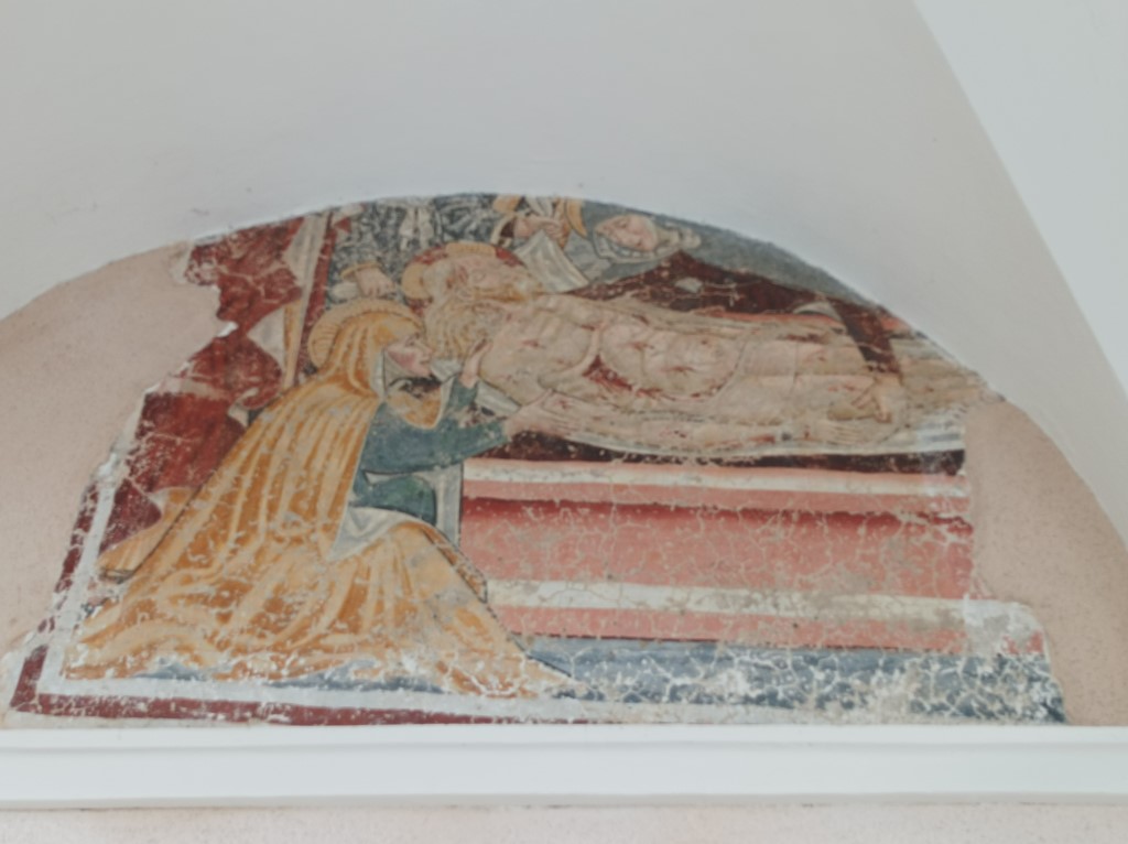 Esterno: sotto l'atrio affresco della deposizione nel sepolcro del '400. |