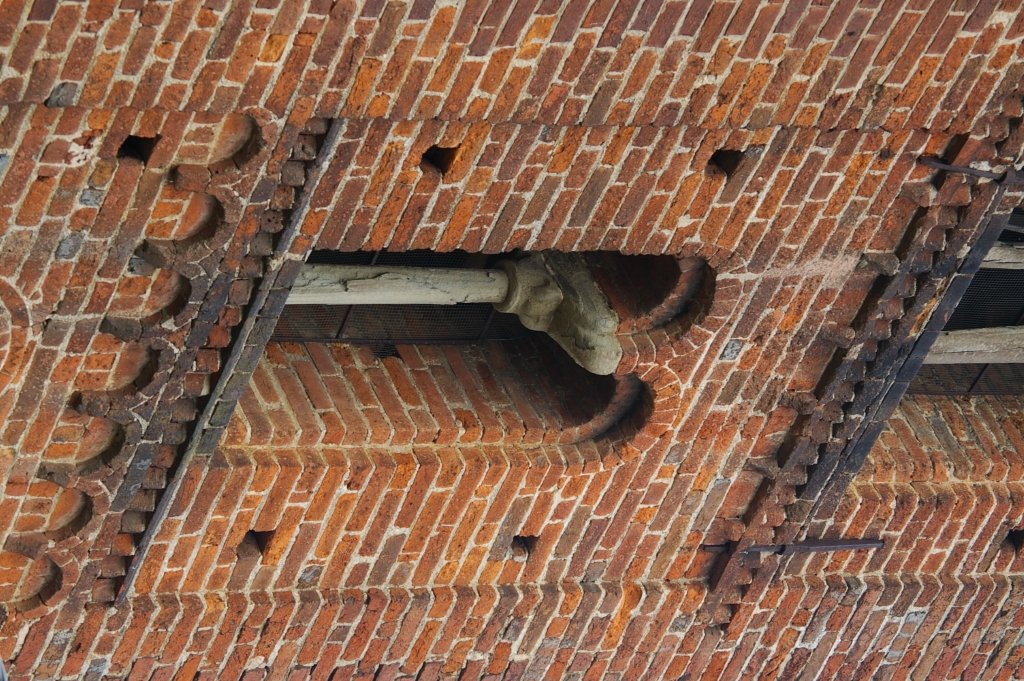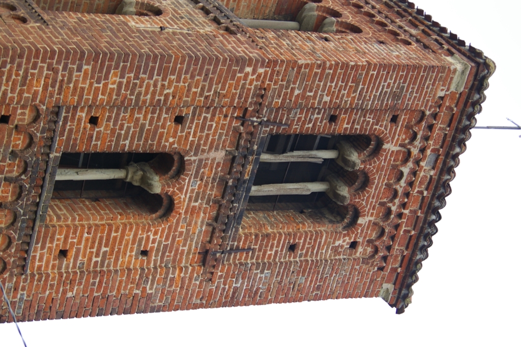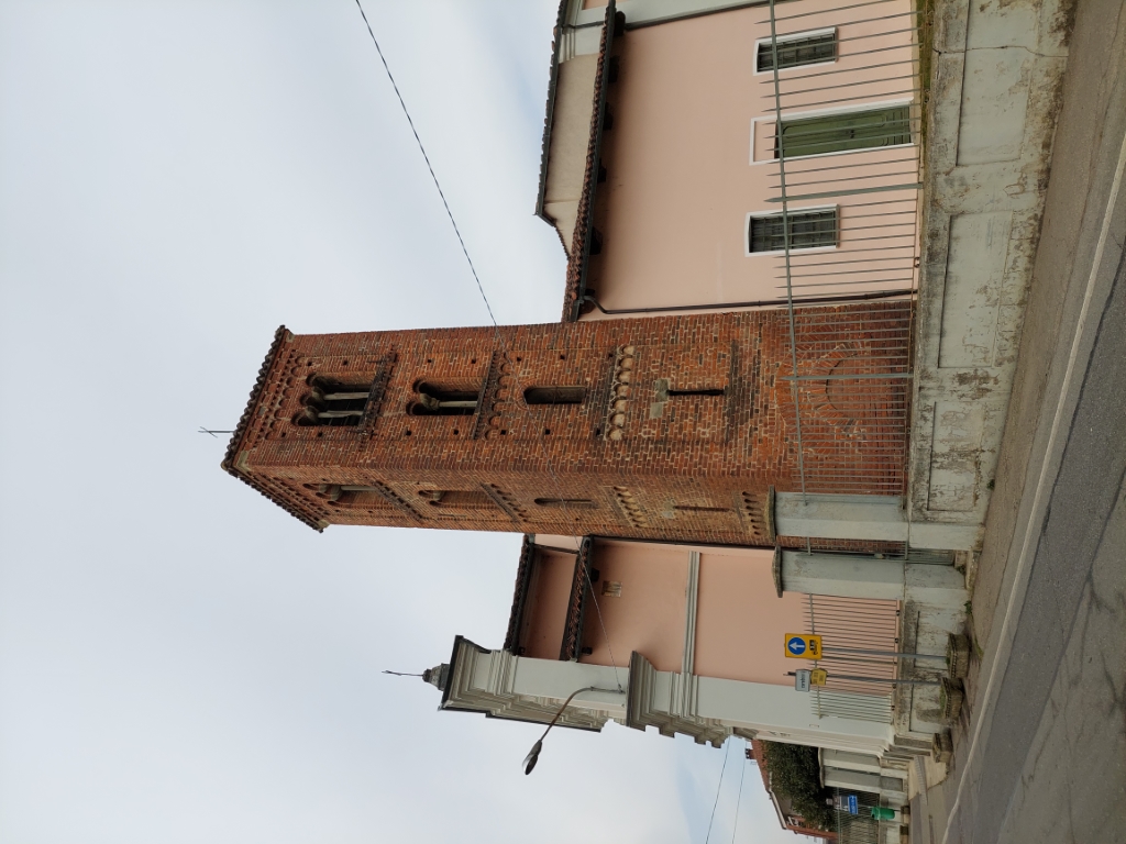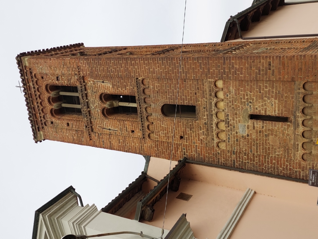 Campanile: romanico del '200 in laterizi a cinque piani aperto da monofore, bifore e trifore; ornato da archetti pensili. |