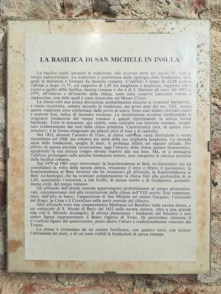 La Chiesa si trova a Trino (VC), nota come San Michele in Insula. Periodo prevalente: XI secolo. Livello di interesse: 2 (Merita una deviazione). Elementi presenti: architettura, pittura. Da vedere: esterno, interno.