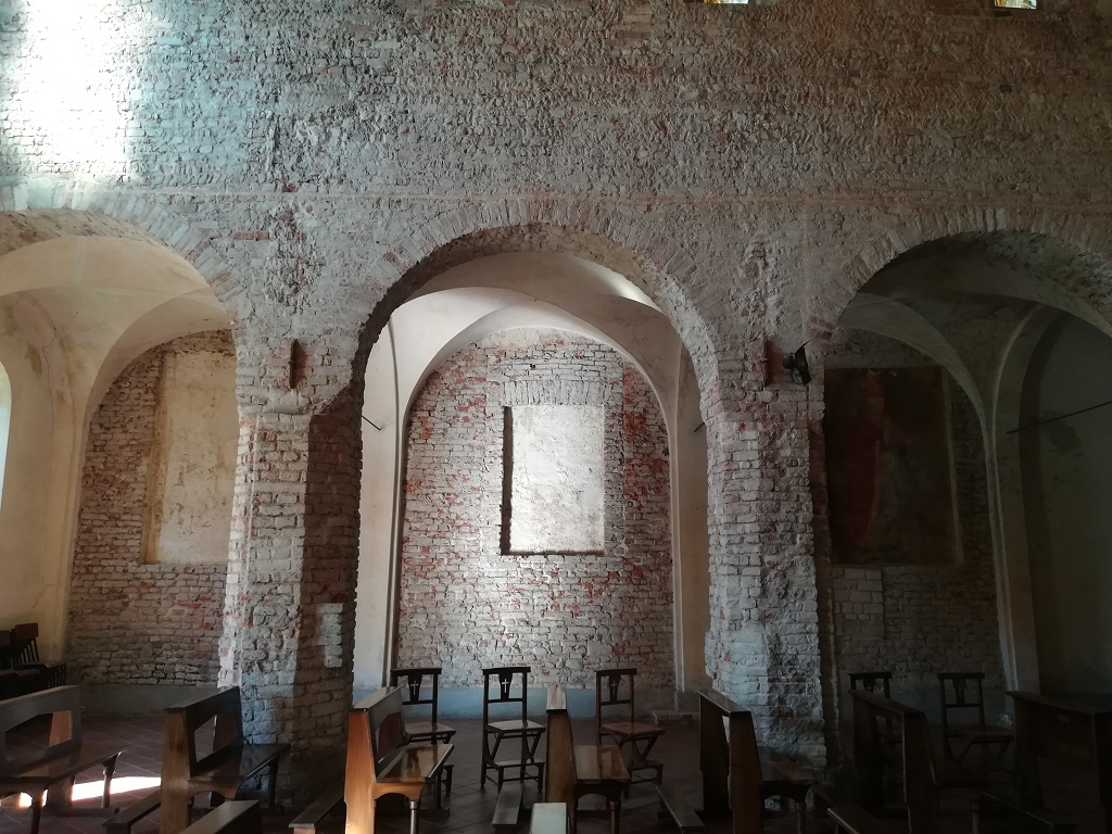 Interno: pilastri ottagonali in laterizio dell'VIII secolo. Affreschi romanici raffiguranti Crocifissione, Cena, Apparizione di San Michele Arcangelo sul Monte Gargano, San Michele che uccide il drago. Crocefisso ligneo gotico quattrocentesco. |