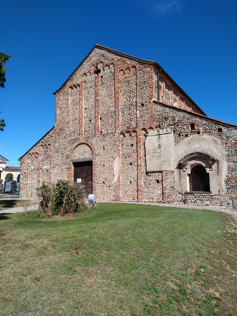 Interno: a tre navate concluse da absidi semicircolari con presbiterio sopraelevato e cripta sottostante; la navata centrale è suddivisa dalle navatelle tramite pilastri a sezione rettangolare raccordati da arconi semicircolari; sotto due degli arconi a sud affiorano i resti di muratura in ciottoli, residui di un edificio più piccolo dell'attuale; a nord della scala di accesso al presbiterio si trovano le basi di un ambone. Affreschi di epoche diverse dal X al XIII secolo si trovano sulle pareti interne: sulla controfacciata un Giudizio universale secondo l'usuale iconografia medioevale, suddiviso in tre registri attorno alla figura del cristo giudice con sottostante fascia ove sono rappresentati i Padri della Chiesa e sotto ancora un finto velario. Il Cristo è andato in gran parte perduto per l'apertura di una finestra rettangolare, ora chiusa. A fianco del Cristo, superiormente, Angeli e Santi con Maria. Inferiormente gli evangelisti a gruppi di sei; ancora sotto dignitari, ecclesiastici e monaci. Al di sopra della scena una fascia a greca, raffigurata prospetticamente. Ai fianchi del portale i beati, a sinistra, di cui restano, entro una struttura architettonica di arcate gialle e rosse, tre patriarchi rappresentati frontalmente con barba e capelli bianchi, reggenti in braccio tre piccole figure maschili. A destra dovevano esserci i dannati, ormai scomparsi. Sulla parete sud della navata centrale, appena entrati a destra, il ritrovamento o traslazione di un Santo, scena ambientata in un paesaggio urbano che ingloba la monofora. In basso a destra si nota la figura di un pavone, simbolo dell'immortalità. Sulla parete nord resti di un affresco raffigurante il busto di una donna aureolata, Secondo Noemi Gabrielli la Vergine Addolorata. Nell'abside maggiore tracce di affreschi di varie epoche e nell'abside meridionale Cristo con sotto i Diaconi dal volto e le mani verdastri, colore di fondo di molti dipinti medioevali secondo le indicazioni del monaco Teofilo. Degli affreschi dell'abside maggiore raffiguranti la "maiestas Domini", restano la mano di Gesù, frammenti raffiguranti un arcangelo che regge un'asta e due teste di angeli, con una tonalità rossa dominante. Al di sotto un affresco ormai praticamente illeggibile, raffigurante due gruppi di cavalieri che si inseguono; in uno dei due gruppi è raffigurata una donna, di cui si intravede il manto rosso che incorniciava il viso, con un bambino stretto al petto. Uno dei sette cavalieri inseguiti è raffigurato mentre cade a terra colpito dalla lancia degli inseguitori. Il tema dell'affresco è difficilmente identificabile, forse si tratta della scena raffigurante un episodio del 1119 in cui la contessa di Biandrate, alla testa delle truppe novaresi e vercellesi, con il figlio Guido in braccio, combatte le truppe comasche. A sinistra frammenti di affreschi di varie epoche tra cui, medioevali, una testa rivolta verso il centro dell'abside e i contorni di due animali di difficile identificazione, forse due buoi o un cavallo e un bue. Dall'altro lato un santo vestito di una tunica bianca e un manto rosato che indica con la destra il libro che regge con la sinistra. Scomparse altre figure che si leggevano sullo zoccolo rasoterra. Le pitture databili per lo più all'XI secolo risentono ancora dell'influenza ottoniana con influssi bizantini. Sopra l'altar maggiore si trova una crocifissione con Maria, San Giovanni Evangelista e San Michele Arcangelo datata 1587, inoltre arme nobiliari nella navata ,maggiore databili XIV secolo, resurrezione del cristo di fine '400 - inizio '500 del pittore novarese Franceschino Cagnola ( ) e sul primo pilastro entrando a destra San Michele Arcangelo del pittore oleggese Johannes Maria de Rumo attivo verso la metà del '500. |