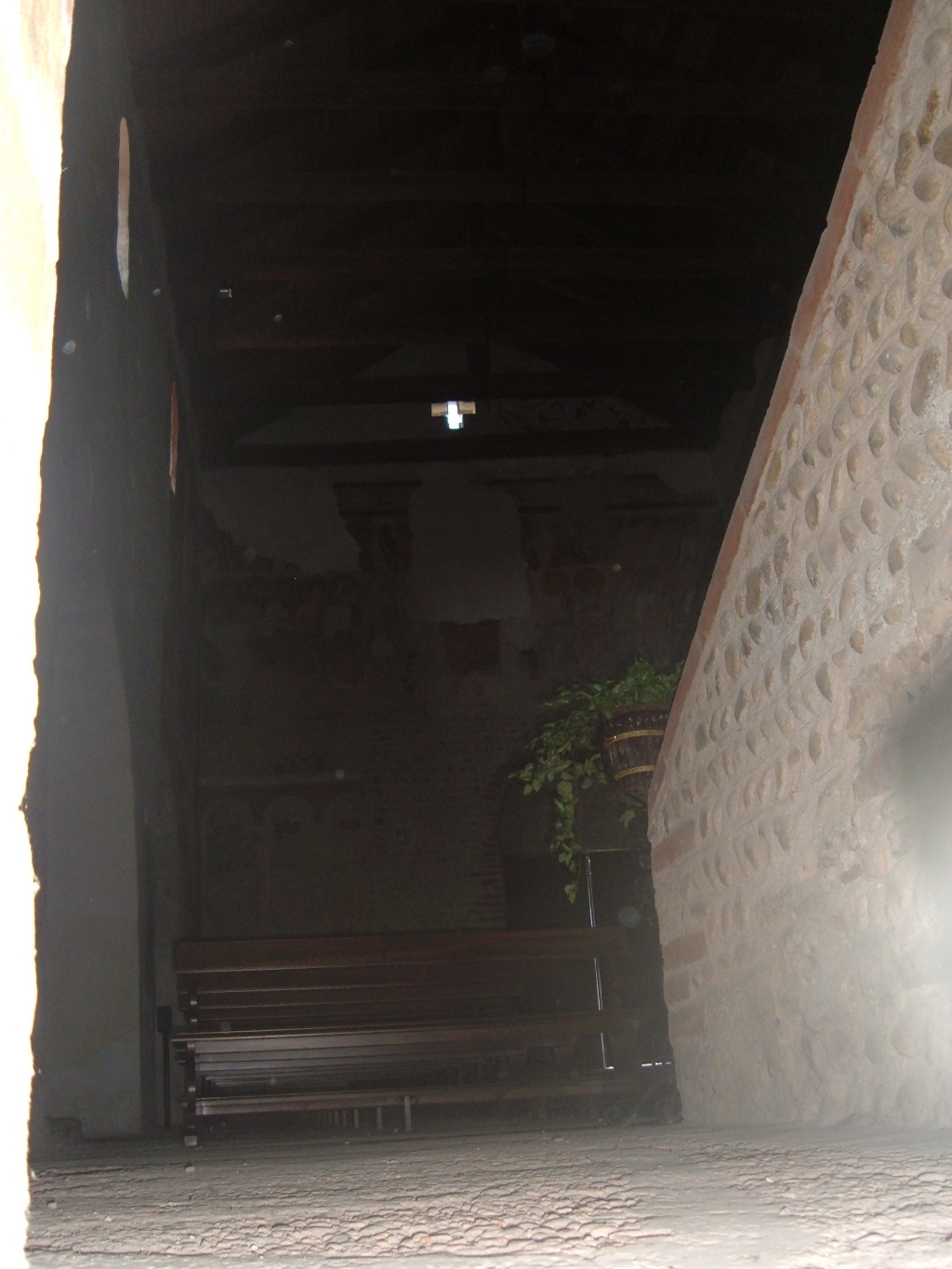 Esterno: facciata dal profilo a salienti interrotti, orientata, asimmetrica, in ciottoli a corsi orizzontali, scandita da sottili lesene raccordate da archetti pensili, rovinata nel suo insieme dall'apertura di una finestra in corrispondenza della navata sud, finestra che si apriva verso l'ossario costruito nel 1710 e demolito nel '900, accanto alla finestra affresco datato 1630 raffigurante scene della peste. La facciata che si presenta non perpendicolare alle pareti, è caratterizzata dall'assenza di aperture se si esclude una finestrella a croce, in centro in alto ed il portale posto in posizione asimmetrica verso sinistra. Le cornici di archetti pensili che coronano ogni specchiatura non seguono il profilo del tetto ma hanno un andamento orizzontale. Nella muratura sia della facciata che del resto della struttura sono presenti molti materiali di reimpiego tra cui tegoloni romani e, nell'angolo sud-ovest un frammento di stele funeraria romana. Sui fianchi la muratura presenta le stesse caratteristiche della facciata con ciottoli disposti su corsi orizzontali e lesene che scendono fino a terra e che scandiscono i fianchi sia delle navate laterali che della navata centrale. Su entrambe è presente un coronamento di archetti pensili a gruppi di tre o quattro e su tutte e due si apre un portale secondario. Le tre absidi, scandite da lesene, si presentano indipendenti le une dalle altre. Le due minori sono coronate da archetti pensili a raggruppati a tre per volta. Su tutte e tre si aprono monofore, alcune tamponate, ad arco a doppia strombatura e in alto, sul frontone della navata centrale si apre una finestrella a croce, come in facciata. |