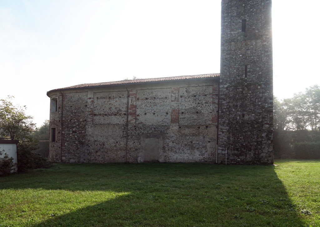 Campanile: in pietra, a cinque piani, eretto tra la fine dell'XI secolo e l'inizio del XII è aperto in alto da trifore. |