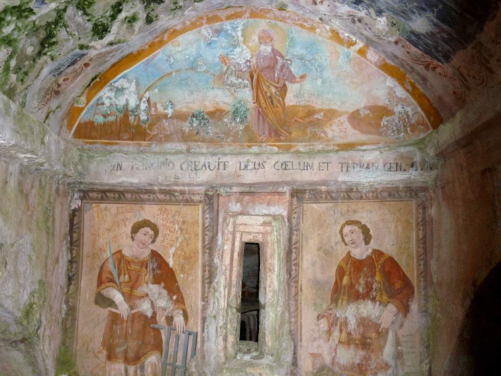 Interno: la cappella di sinistra, abside originaria, conserva un ciclo di affreschi del '400 con Cristo nella Mandorla e Teoria di Apostoli. |