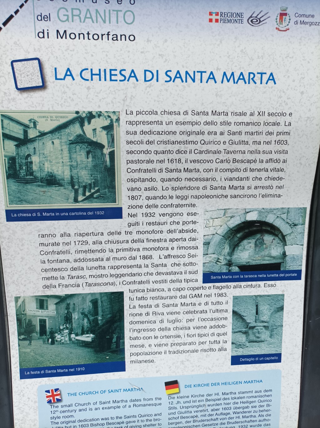 La Chiesa si trova a Mergozzo (VB), nota come Santa Marta. Periodo prevalente: XI secolo. Livello di interesse: 2 (Merita una deviazione). Elementi presenti: architettura. Da vedere: esterno.