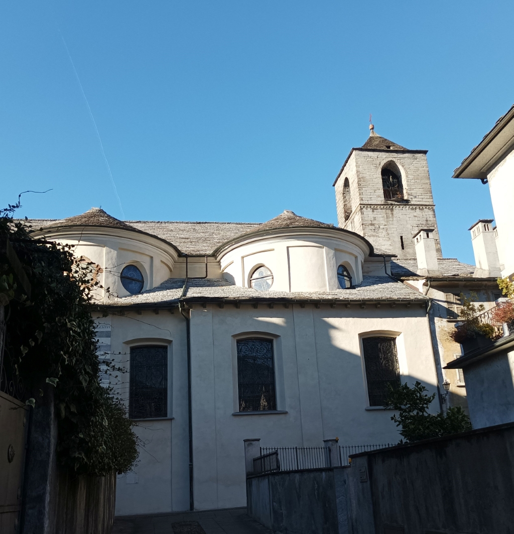Notizie generali: nota sin dal 840, abbattuta durante il dominio visconteo per far spazio all'ampliamento del castello fu ricostruita tra il 1450 e il 1470 conservando il portale romanico dell'antico edificio ed aggiungendo verso il 1650 l'elegante protiro. Pericolante fu ristrutturata nel 1793 e completata con la facciata del 1954. Nell'interno neoclassico tela di Tanzio da Varallo (1575-1635) rappresentante San Carlo che comunica gli appestati. |