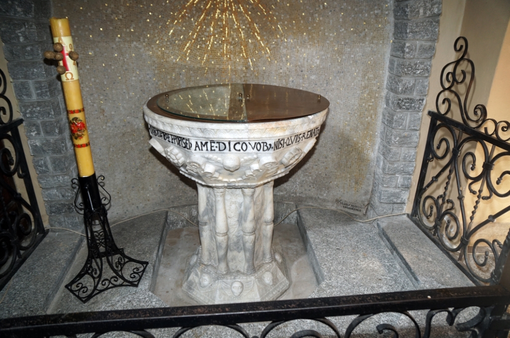 Interno: fonte battesimale circolare in marmo del 1566. |