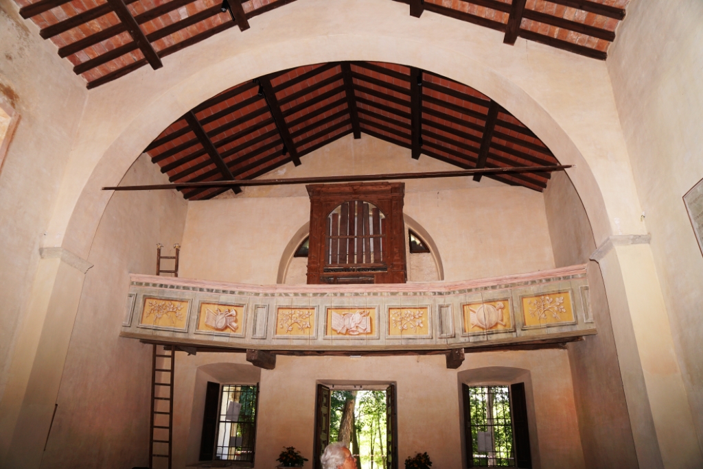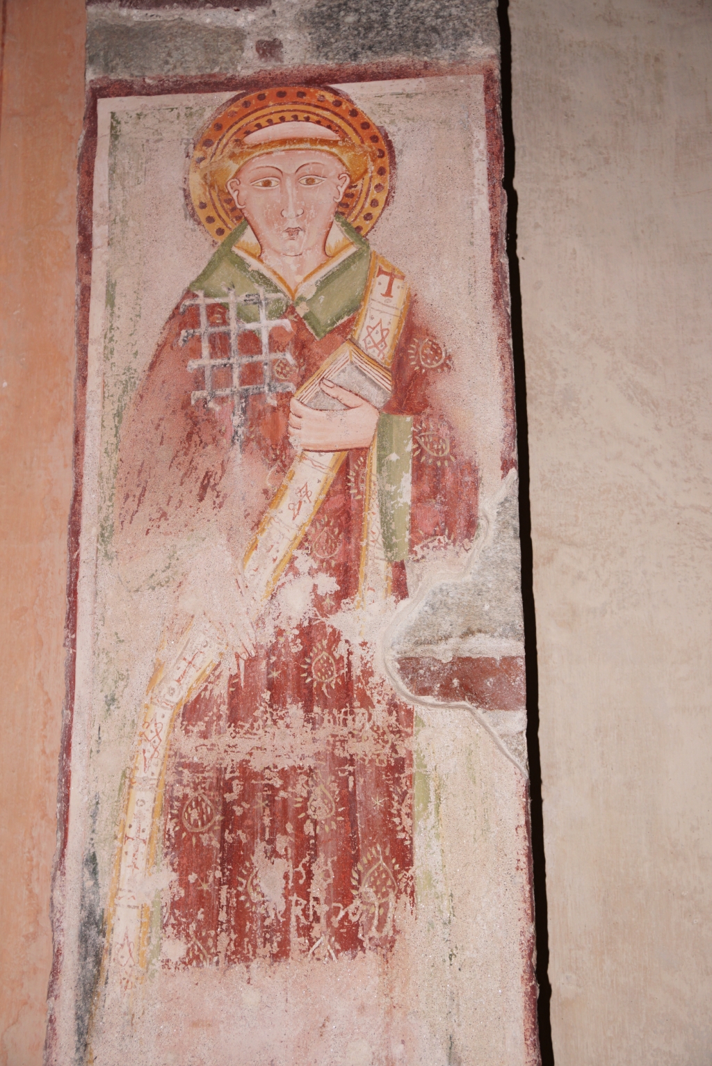 Interno: sul lato destro, affreschi del quattrocento di autore ignoto rappresentanti San Lorenzo, con la tradizionale graticola in mano, parzialmente conservati in buono stato. |