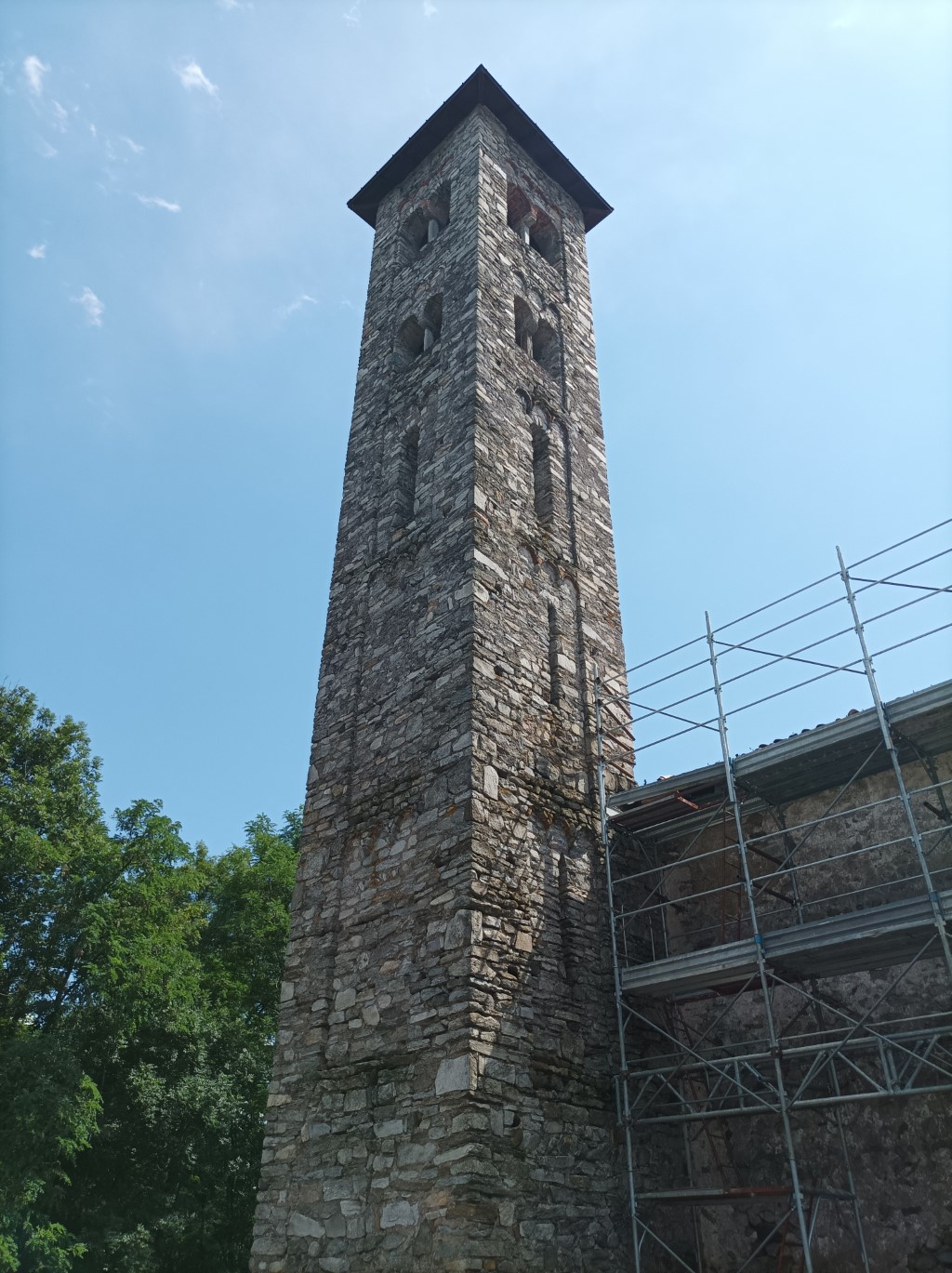 Campanile: a cinque ordini evidenziati da cornici di archetti pensili, di esecuzione più accurata rispetto alla chiese, cosa che lo fa datare a un periodo più tardo. |