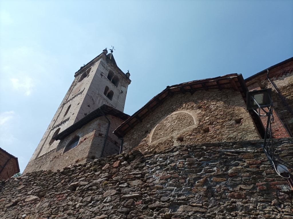 Campanile: romanico con monofore e bifore, cuspide a scaglie maiolicate e pinnacoli del '400. |