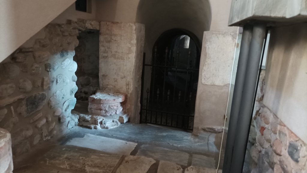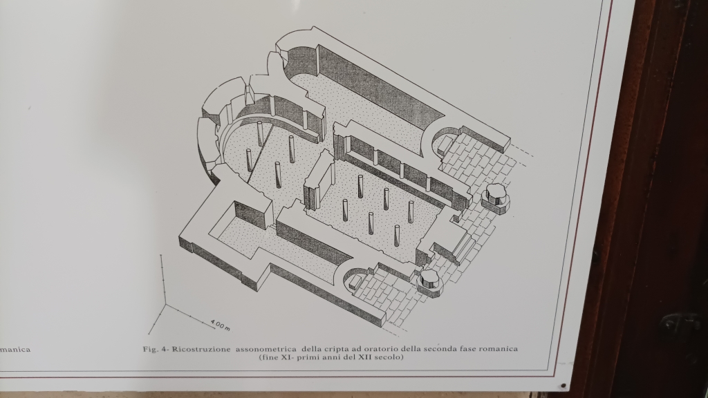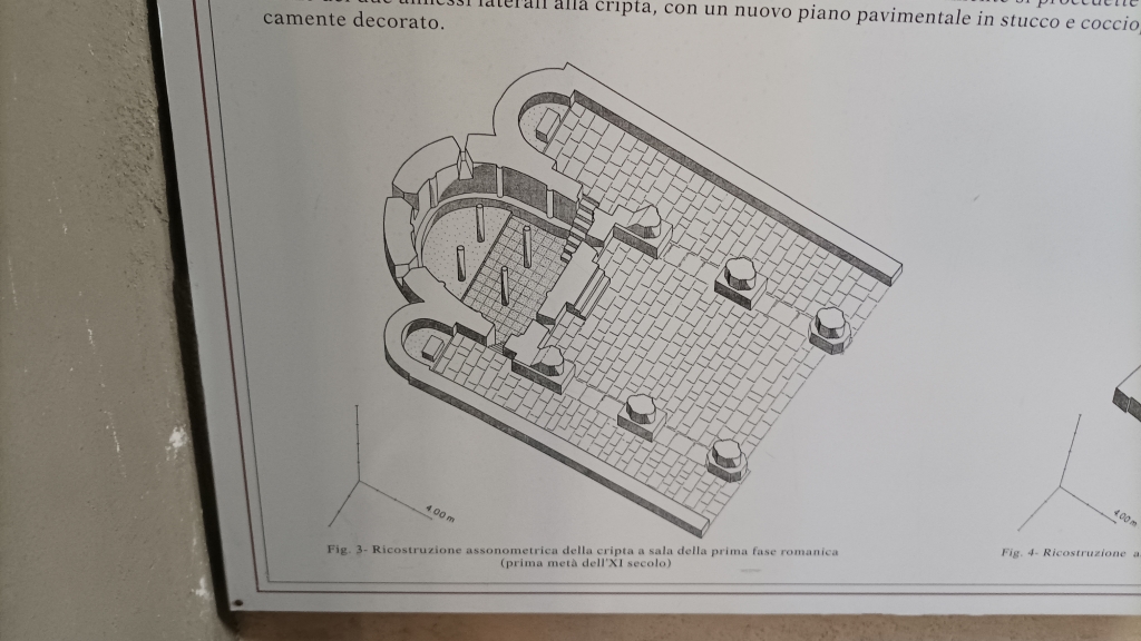 Cripta: l'ingresso è collocato sul lato sinistro della chiesa; presenta una struttura sorretta da esili colonnine di materiale misto recuperato in parte da precedenti costruzioni; gli archi sono stati rimaneggiati. Alle pareti, appoggiate, frammenti di epigrafi e decorazioni altomedioevali. In locali attigui alla cripta tracce di affreschi. |