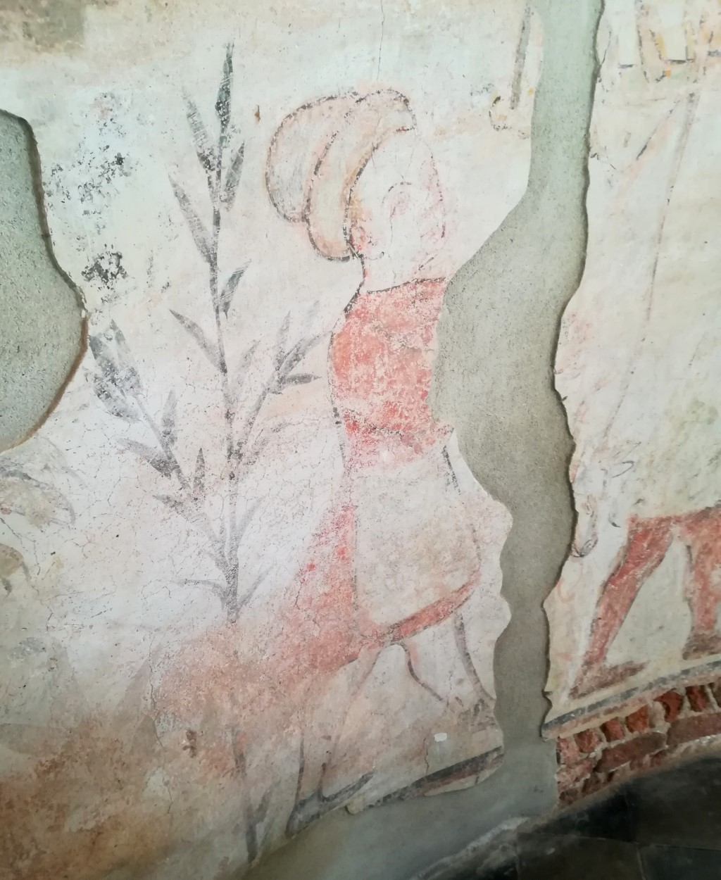Interno: affreschi del tardo '400 raffiguranti Cristo Giudice attorniato dagli apostoli, simboli degli Evangelisti e allegorie dei lavori dei mesi nell'abside. Nella tazza dell'abside è raffigurato il Cristo Pantocratore, che con la mano sinistra regge il libro della vita, mentre tiene spiegati l'indice ed il medio della mano destra. Il Cristo è assiso nel nimbo a mandorla che simboleggia il Paradiso, attorniato dai Simboli dei quattro Evangelisti: l'Aquila, il Leone alato, L'angelo e il Vitello alato. Una fascia composta dagli Apostoli, ritti in piedi, contraddistinti dai "Titula" oggi illeggibili e dai rispettivi simboli iconografici, riempie il centro del catino absidale. Alla serie di Apostoli mancano due figure, rimosse nel 1875 nel corso dei restauri per portare alla luce le due monofore originali della struttura romanica. Nella zona inferiore del catino absidale, delimitata da due fasce di colore rosso e nero, si trova un secondo ciclo di affreschi. Sono dieci pannelli, divisi uno dall'altro da un alberello, che illustrano i costumi, le attività, il modo di vivere nel XV secolo. Rappresentano il ciclo dei mesi, strettamente connesso allo svolgersi dell'anno solare e legato al lavoro dei contadini. I mesi vanno da aprile a gennaio. - Aprile: rappresentato da un giovane biondo, con una tunica rosso arancio, che stringe nelle mani due pianticelle. - Maggio un nobile, vestito con una lunga tunica verde, in groppa ad un cavallo arabo, va a caccia con il falco - Giugno: un giovane contadino con una corta tunica bianca, in mezzo ad un campo, sta mietendo il grano - Luglio: un giovane contadino, vestito con la stessa corta tunica bianca, sull'aia, sta trebbiando il grano - Agosto: un bottaio, con una corta tunica rossa, sta fissando i cerchi di ferro di una botte - Settembre: un contadino, vestito con una corta tunica chiara allacciata da bottoni, con le gambe nude, pigia l'uva nel grande tino, appoggiandosi con la mano destra al bordo - Ottobre: un giovane con una corta veste di colore verde, con una lunga pertica butta giù le castagne dall'albero. Sono visibili i ricci marroni fra le foglie verdi - Novembre: un uomo, con una corta tunica rossa protetta da un grembiule bianco legato attorno alla vita, sta squartando un maiale morto appeso a dei pioli per le gambe posteriori - Dicembre: un macellaio, con tunica bianca su calze rosse, tiene una mazza di legno sollevata sopra la testa, nell'atto di abbatterla sul capo di un vitello, legato con una corda attorno al collo in modo che non possa abbassare la testa - Gennaio: una donna è seduta in una poltrona rotonda. La donna ha le mani protese verso la fiamma del focolare nell'atto di volerle scaldare. Alla catena del camino è appesa una pentola di bronzo con tre piedini. |