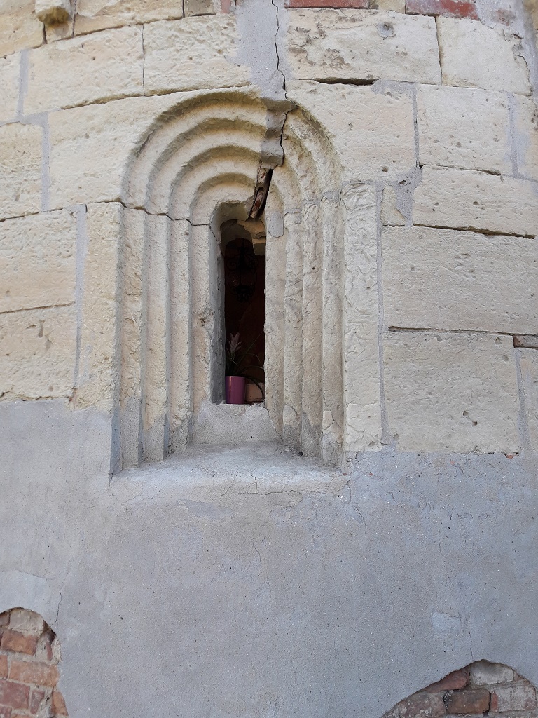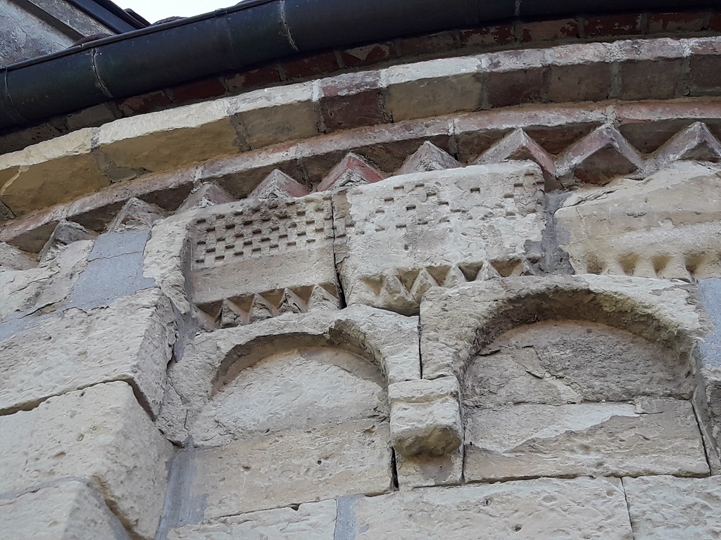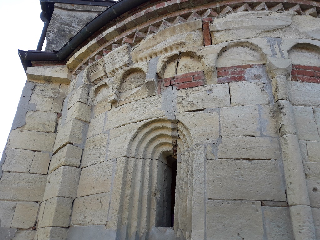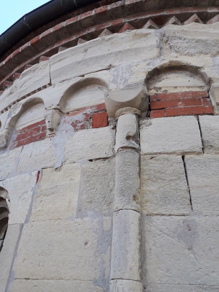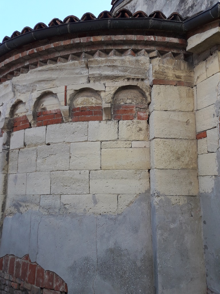 Esterno: abside semicircolare in pietra con resti di fregio a damier e dente di sega. Bel peduccio antropomorfo. Monofore dalla profonda strombatura "a gradini". |