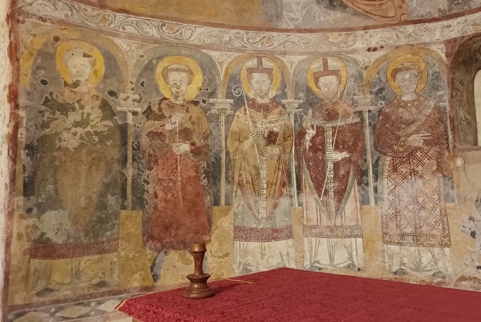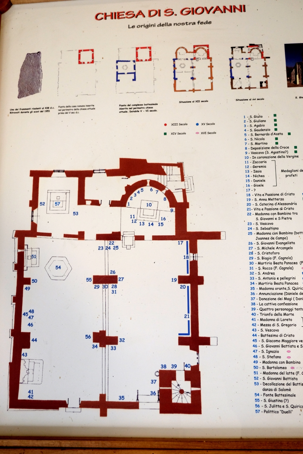 Notizie generali: fondata sull'area di un cimitero romano, trae origine da una costruzione romana (in parte l'attuale abside destra) a cui venne affiancato un fabbricato rettangolare adibito a battistero. Nell'XI secolo vennero collegati i tetti delle due costruzioni ed in seguito aprendo grandi arcate nei muri divisori, le due costruzioni vennero rese comunicanti: resta il dislivello fra i pavimenti delle due costruzioni. |