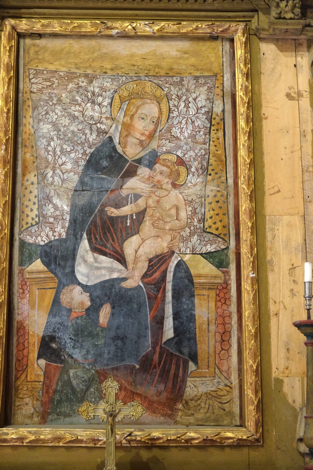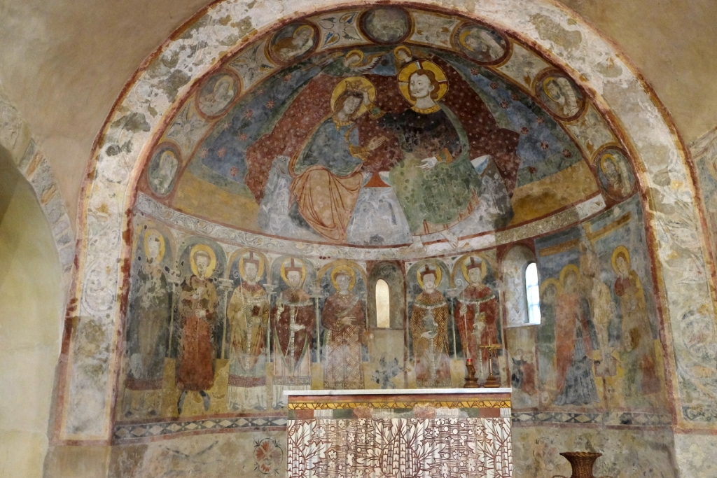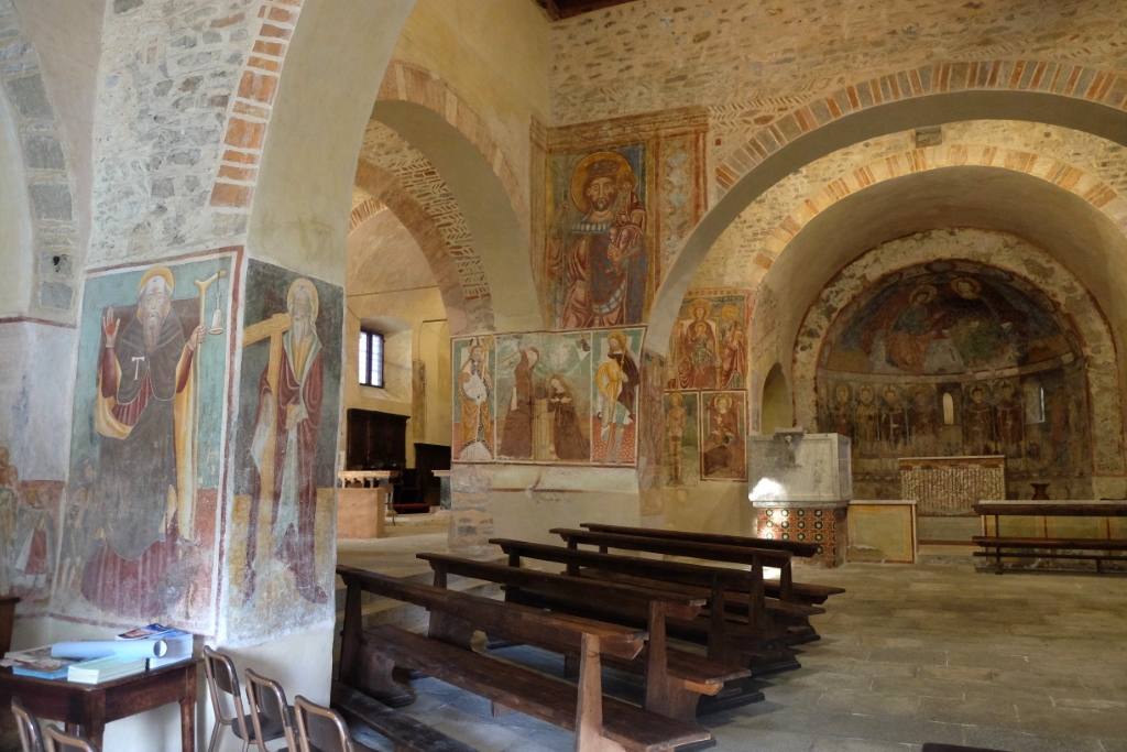 Interno: affreschi di varie epoche: il più antico, risalente alla seconda metà del 200, si trova nella navata destra, a sinistra delle prima campata e raffigura la Madonna in trono fra i Santi Pietro e San Giovanni Battista, lo stile presenta l'influenza dello stile bizantino; alla stessa epoca, sui pilastri centrali San Cristoforo, San Michele Arcangelo e San Sebastiano.. Nel catino absidale affreschi della metà del '300 tra cui Incoronazione della Vergine e figure di Santi e una Deposizione. Alle pareti della seconda e terza campata Storie della vita e della passione di Gesù del tardo '400 e su un pilastro il Martirio della Beata panacea. Altri affreschi, qualitativamente minori, risalgono alla fine del 400 e del '500, cinquecentesco è un martirio della Beata Panacea tra i Santi Biagio e Rocco, attribuiti a Francesco Cagnola. Al centro dell'altare in fondo alla navata di sinistra è stato ricostruito il battistero ad immersione, dominato da un polittico con predella rappresentante la Madonna col Bambino e Santi forse opera di Gaudenzio Ferrari (circa 1477-1546) o di Bernardino Lanino (1512-1583). Al secondo altare Madonna col Bambino attribuita al Cagnola (morto nel 1509). Nella cappella a sinistra della chiesa Deposizione lignea della metà del '400 di artista valsesiano. |