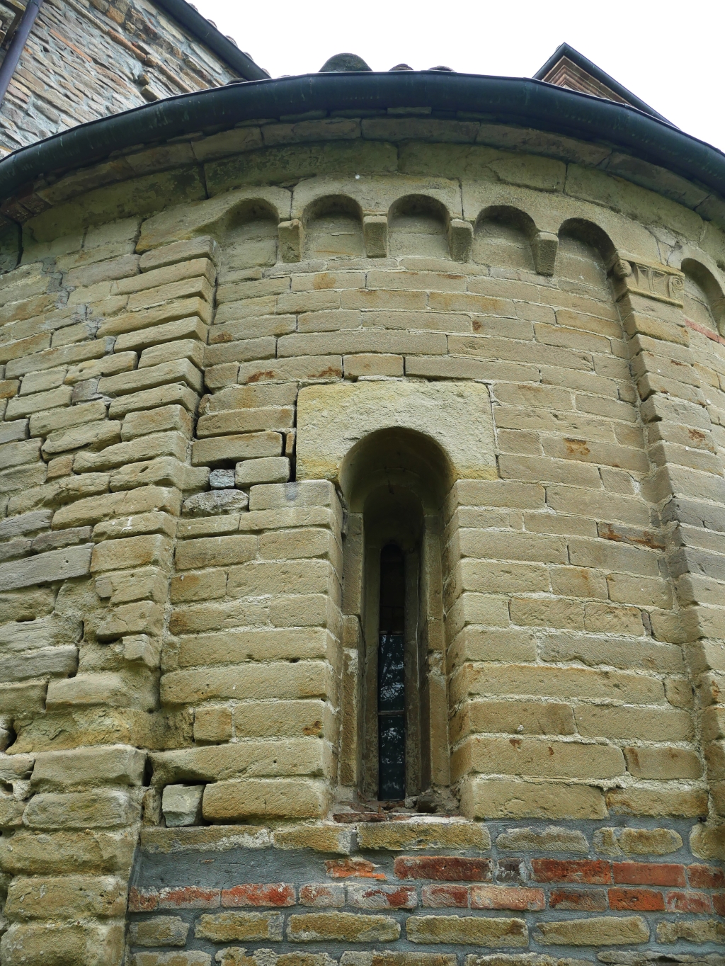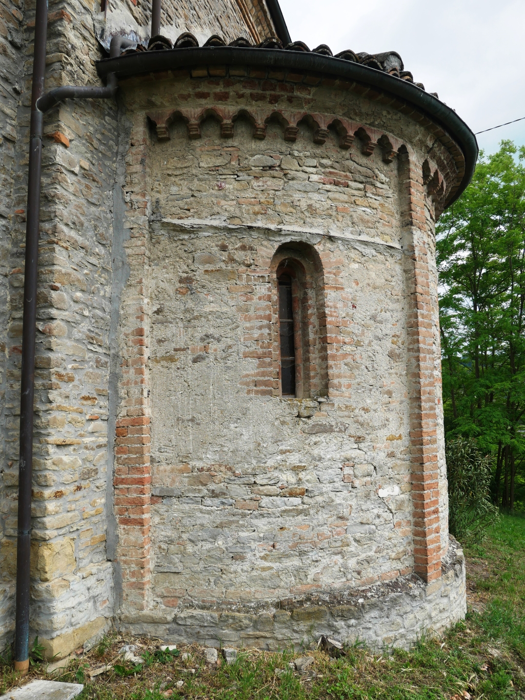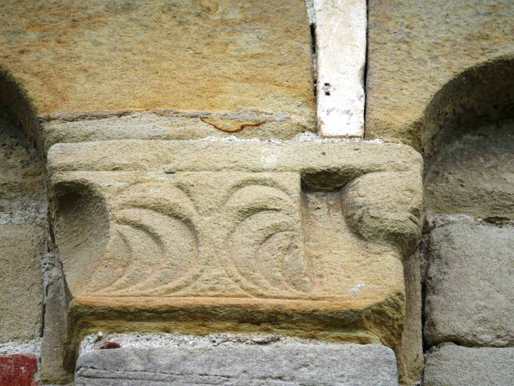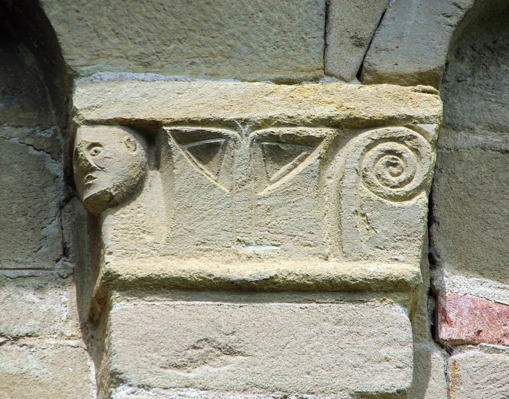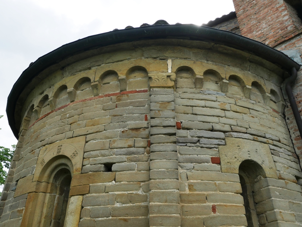Esterno: abside poligonale e due absidi semicircolari poste ai lati; facciata in pietra. Belle decorazioni in arenaria. |