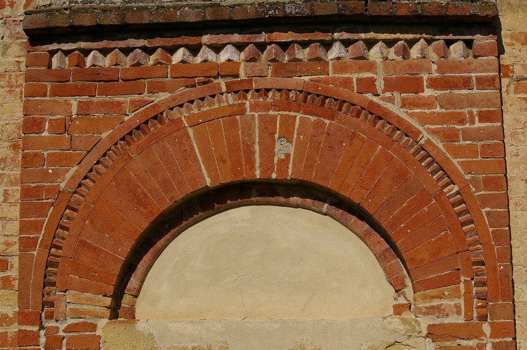Esterno: facciata con portale con stipiti a fasce alterne di mattoni e blocchi di tufo, sovrastato da un architrave in materiale tufaceo e da un arco a ghiera composto da materiali laterizi lavorati in vario modo e collocati in più fasce. |