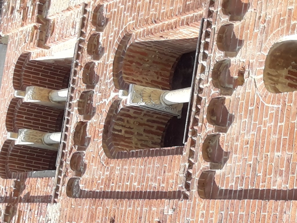 Campanile: a pianta quadrata di 4,9 metri per lato, alto in origine circa 18 metri, attualmente si leggono sei livelli con archetti pensili e monofore e bifore con capitelli in arenaria decorati con motivi floreali |