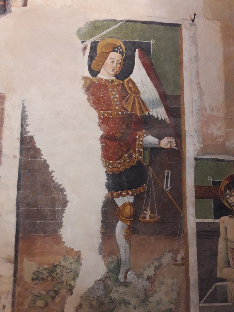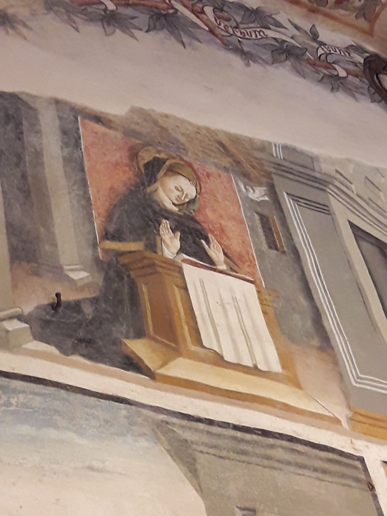 Interno: affreschi di Jacopino Longo (notizie dal 1508-morto dopo 1546) del 1542. La successione degli affreschi si può suddividere in tre gruppi: quello principale, contenente un ciclo mariano, dipinto sulla parete absidale, dietro l'altare; gli altri due gruppi, che riguardano le opere presenti sulle pareti laterali, contenenti raffigurazioni di santi. |