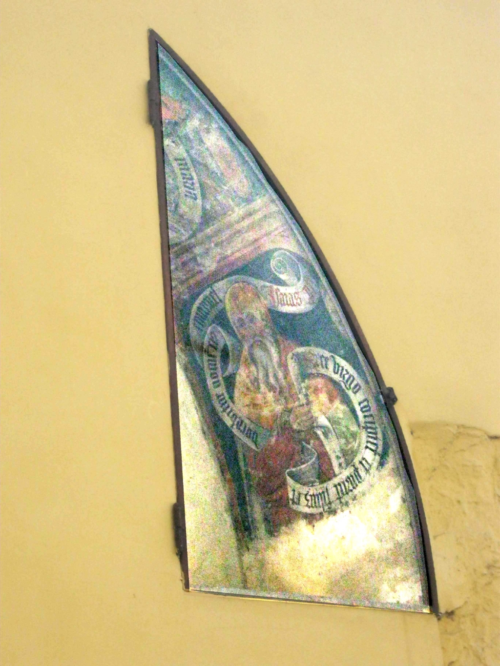 Esterno: in due nicchie create sulla parete laterale esterna della chiesa dal lato del campanile, spezzoni di affreschi databili tra la fine del '300 e l'inizio del '400, coevi a quelli di San Bernardino di Lusernetta e forse della stessa mano. Fanno probabilmente parte di un ciclo dedicato alla Natività e correvano sulla facciata interna di un arco che dava forse accesso a una cappella. Sono riconoscibili un angelo della Natività e nella nicchia verso la facciata il profeta Isaia ed un cartiglio "Ecce virgo concipiet et pariet filium et vocabitur nomen Emmanuel" |