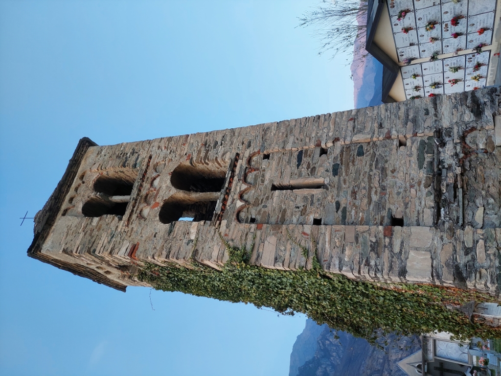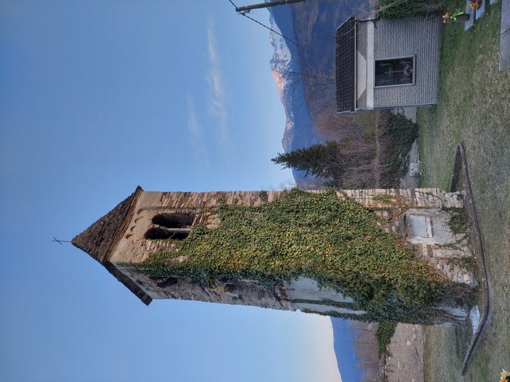 Campanile: dell'XI secolo, isolato nel cimitero. |