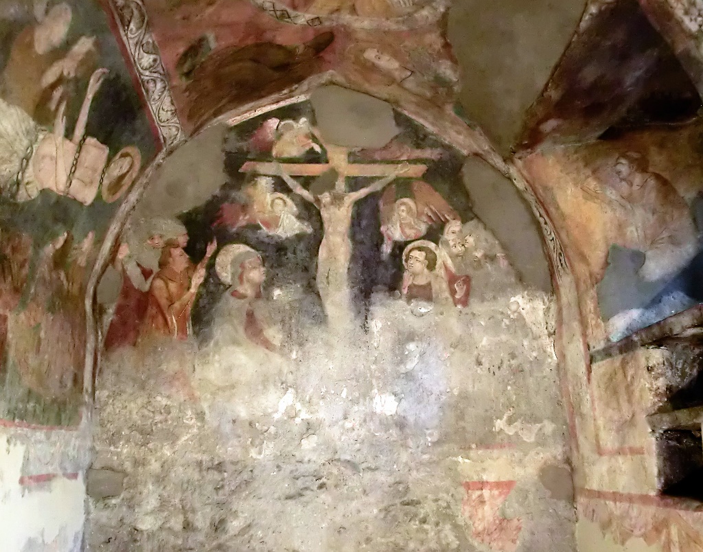 Interno: in un vano a sinistra dell'ingresso affreschi del '300 simboleggianti il pellegrinaggio: Visita dei Re Magi e ciclo dedicato a San Cristoforo. Ciclo di affreschi dedicato alla bibbia e ai vangeli di stile franco piemontese. |