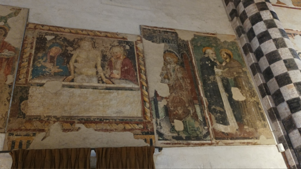 Interno: L'interno, basilicale a tre navate, presenta colonne che reggono archi ogivali e volte a crociera cordonate. Sulla parete sinistra dell'ultima campata della navata sinistra avanzi di un gruppo di affreschi di mani diverse databili XV-VI secolo e attribuiti a Giorgio Turcotto (attivo nella seconda metà del XV secolo) e a seguaci di Macrino d'Alba (circa 1494-1528). |